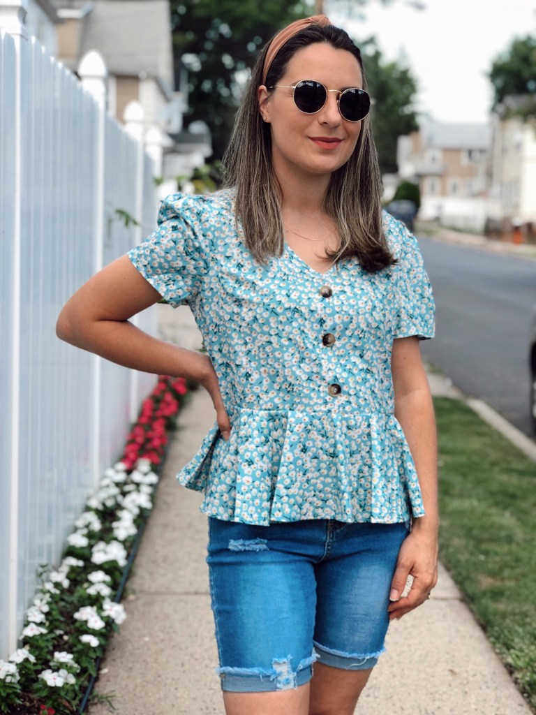 I’ve been trying to spend some time outside to enjoy summer as much as I can while following precautionary directions and keeping social distance. This week I just took the kids for a little outside snack break. We put the blanket on an empty grass space on a park close to our house and just picnicked right there. Feels good to be out! I wore this cute flowy peplum top and denim shorts. Such a cute outfit to be out and about. I love to wear cute tops with denim shorts. I can dress it up with sandals or just with sneakers for a cool laid back look.