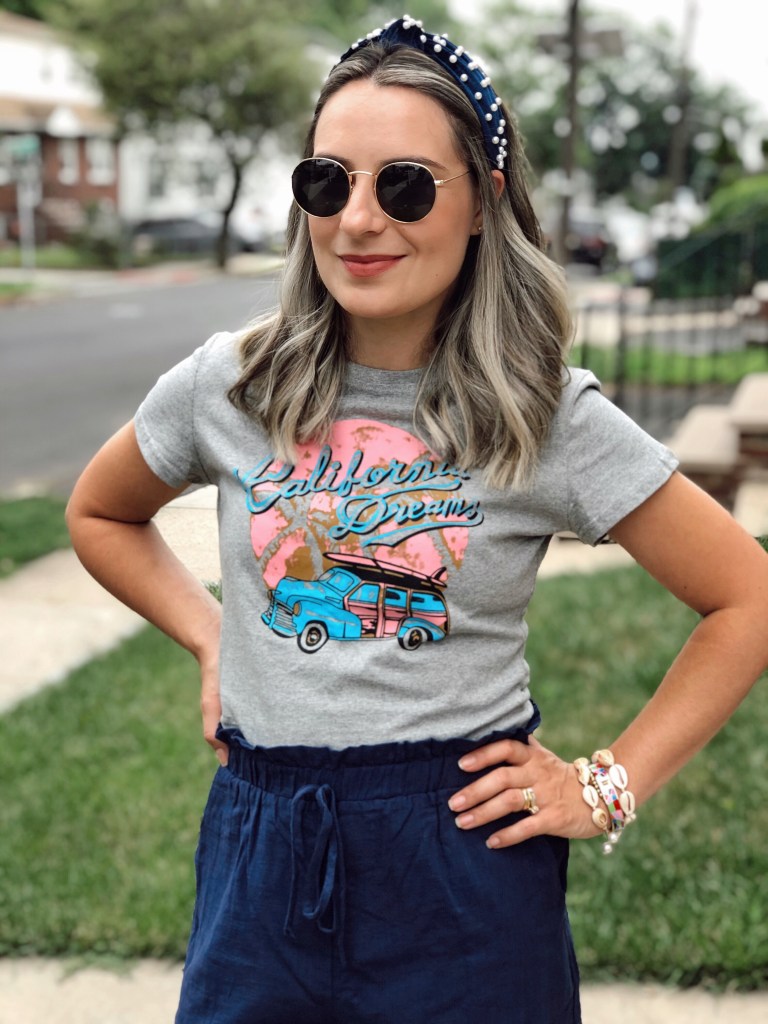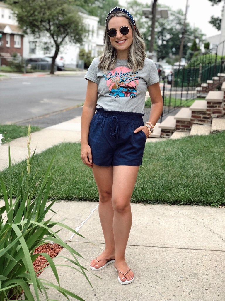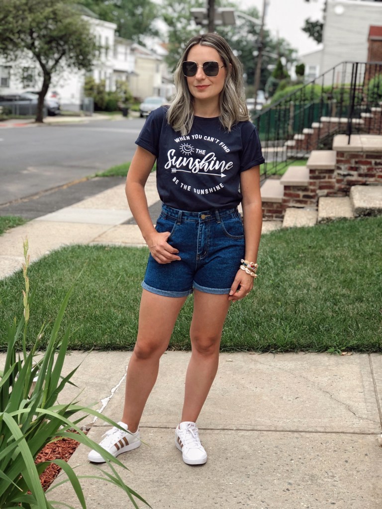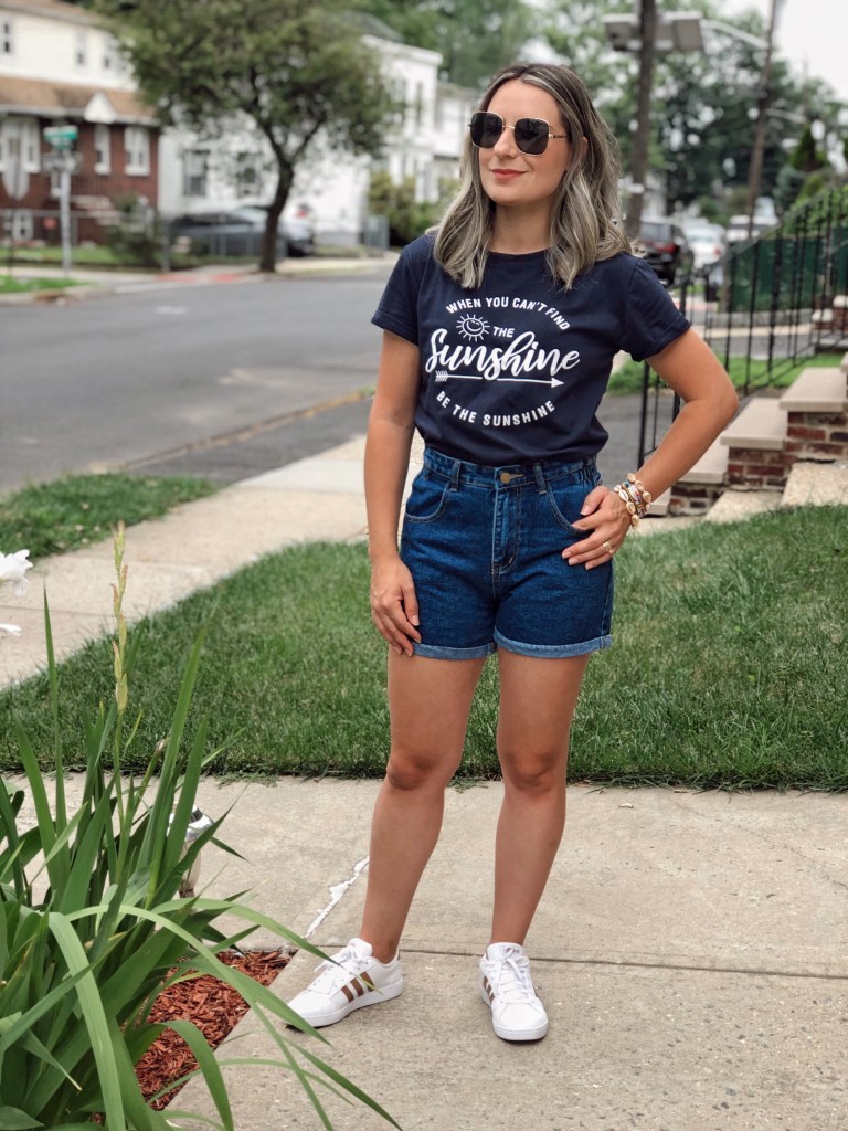 The first look is one of my favorites and such a classic. Basic graphic tee and denim shorts. I usually like to wear white sneakers. Looks cute and makes the perfect comfy look.