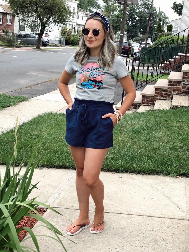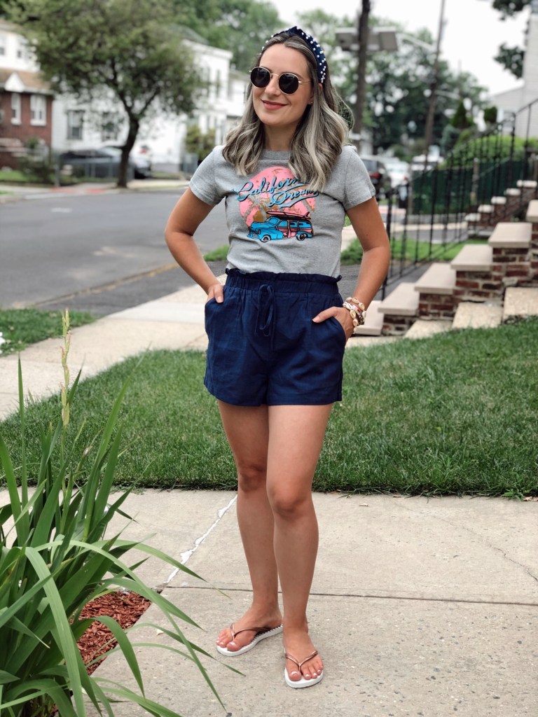 The second outfit is so laid back with a cute print tee shirt and linen shorts. Super comfortable and perfect for summer. I wore it with flip flops for an even more relaxed look.