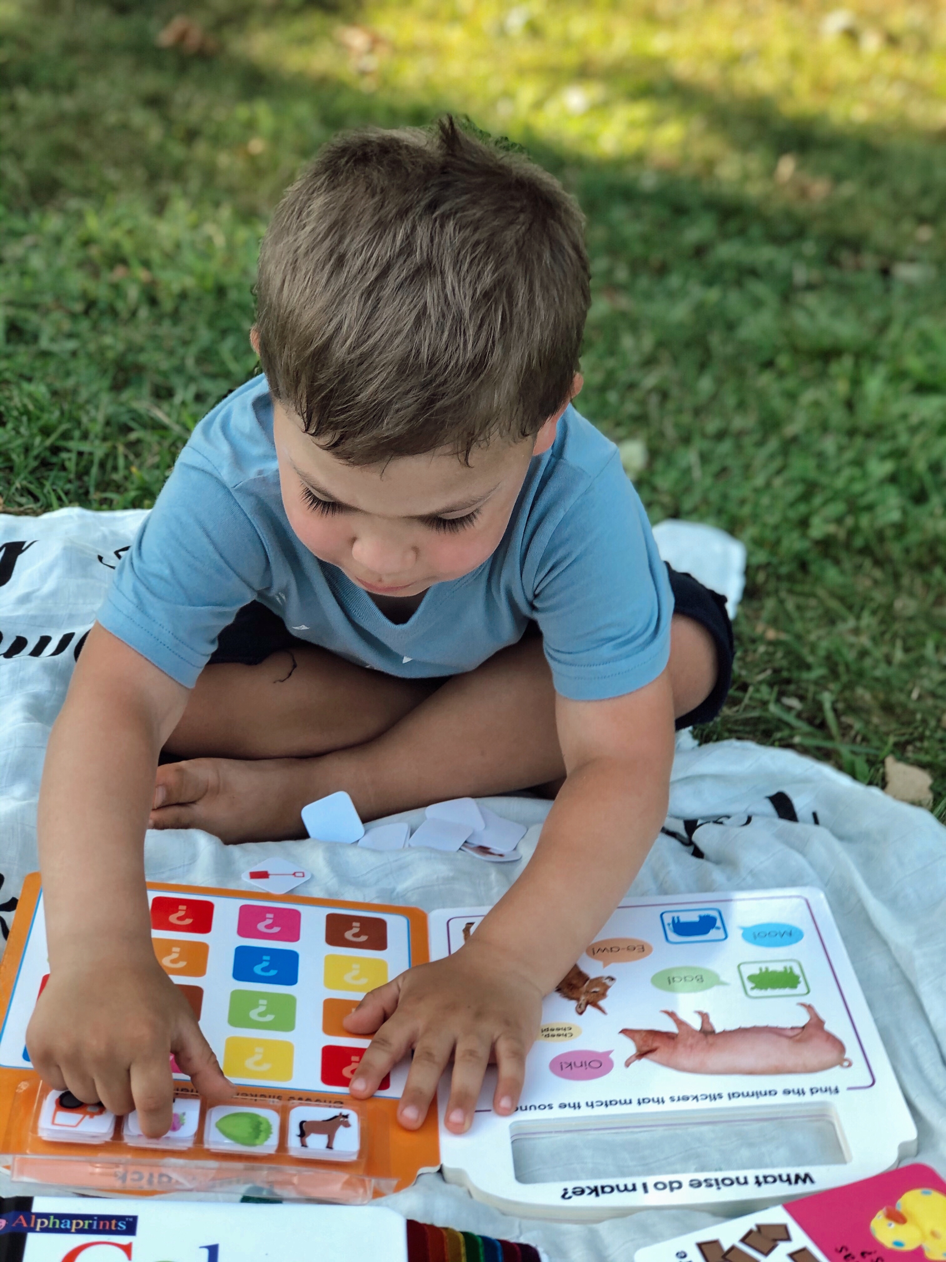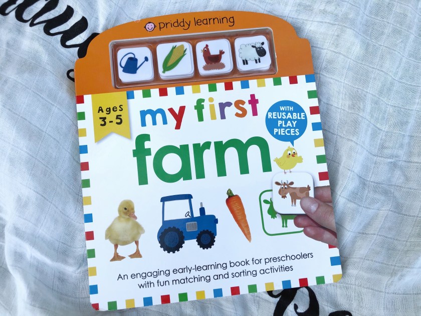 Lastly, this one I recommend for your older kids. My boy is 3 and he is in love with this book. Kids can take a trip around the farm and learn about key early learning topics such as colors, matching, and sorting. There are 28 reusable play pieces, so the activities can be completed again and again. The handle-shaped book has a clamshell on the cover to store the pieces.