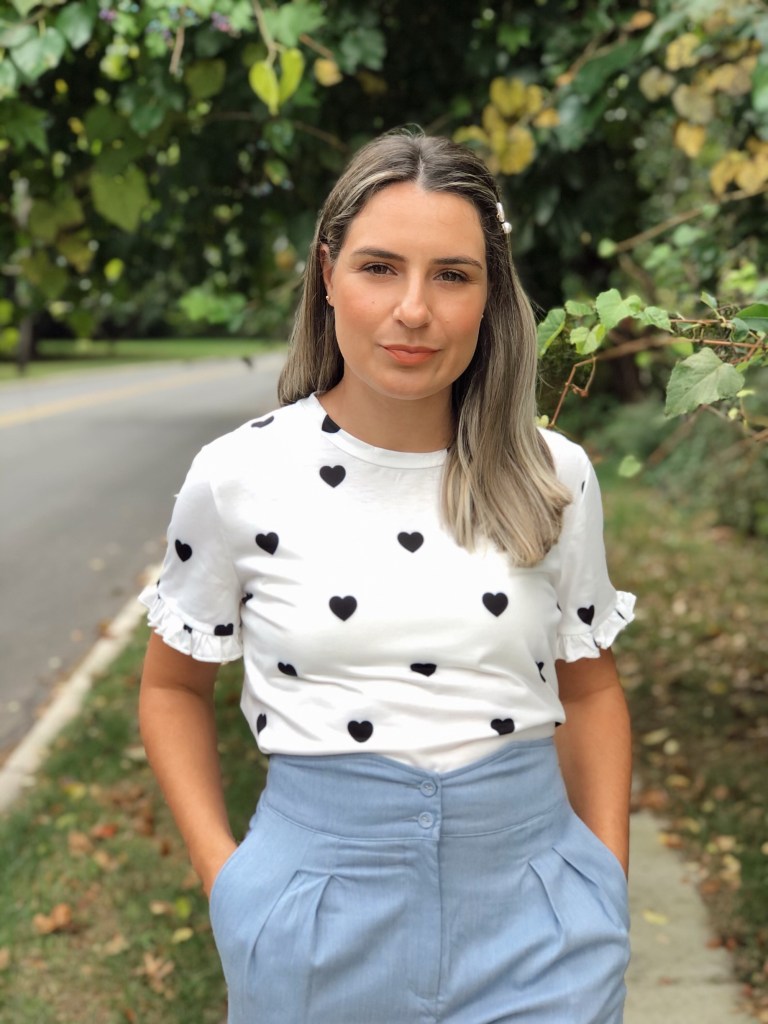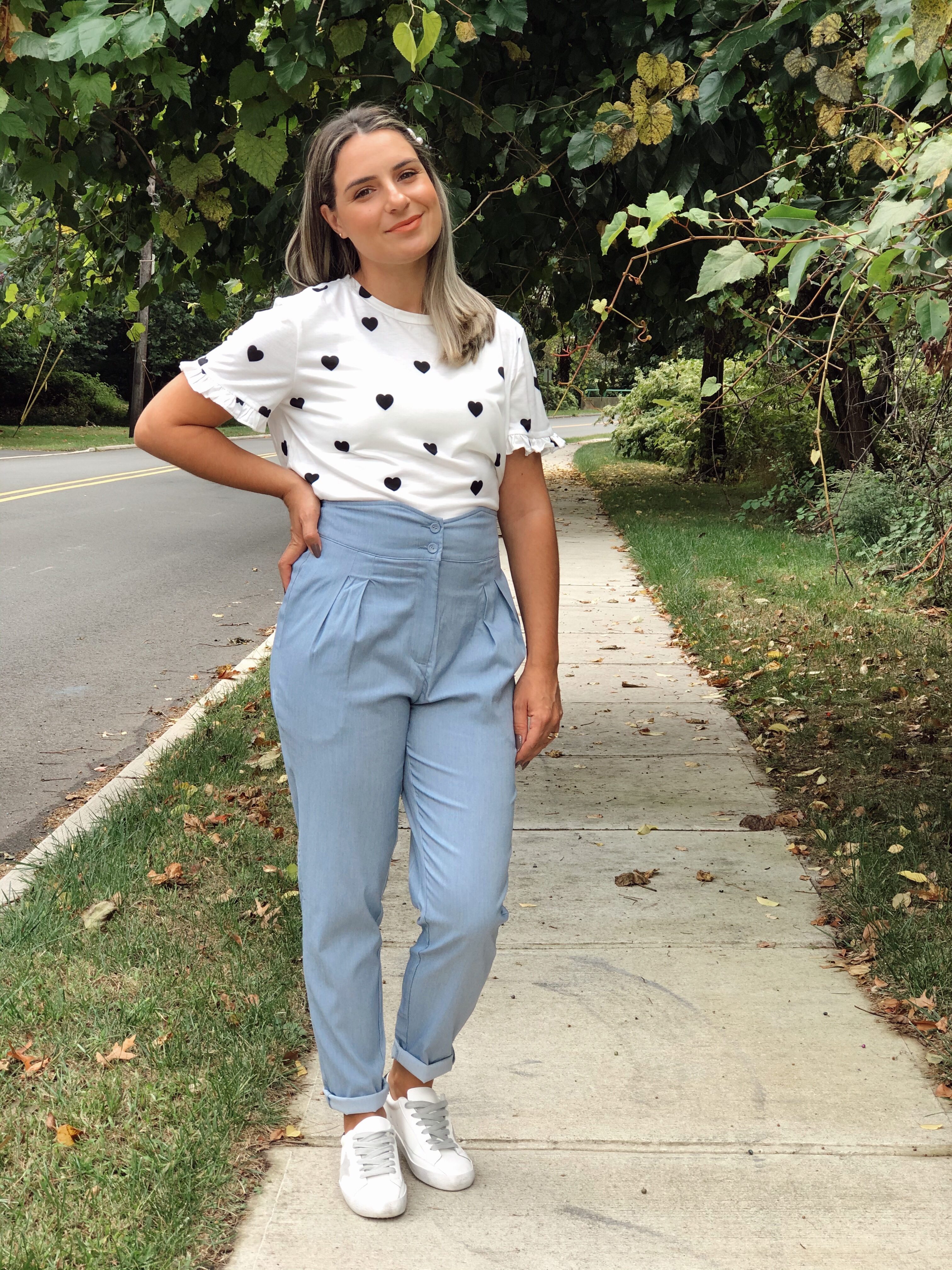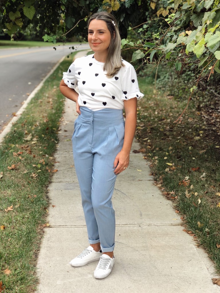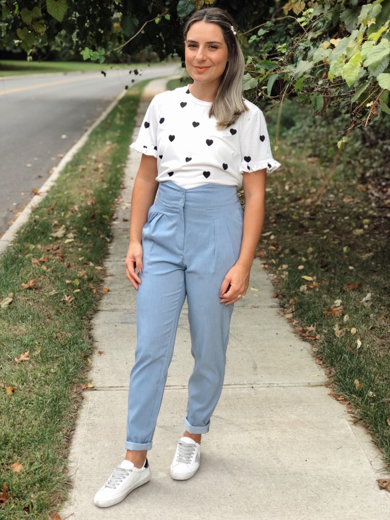 Happy monday! I had a busy day running errands and nothing better that an outfit that can be versatile. I am loving this tailored pants. The material is super soft and the blue looks like denim. What I really like is that you can wear it with sneakers, flats or heels and it looks beautiful. Since I had lots to do, I chose white sneakers thats comfy to walk around and paired it with a cute heart print tee shirt. I love how it turned out. Shein always has great deals and you can use code D2padoni to get an extra 15% off any purchase.