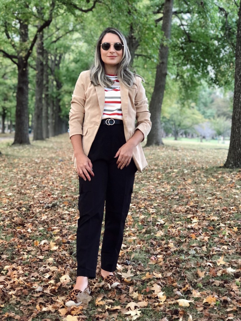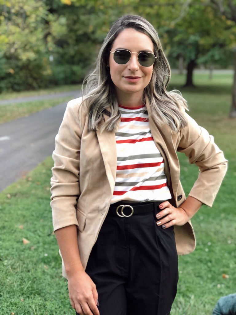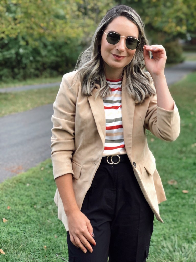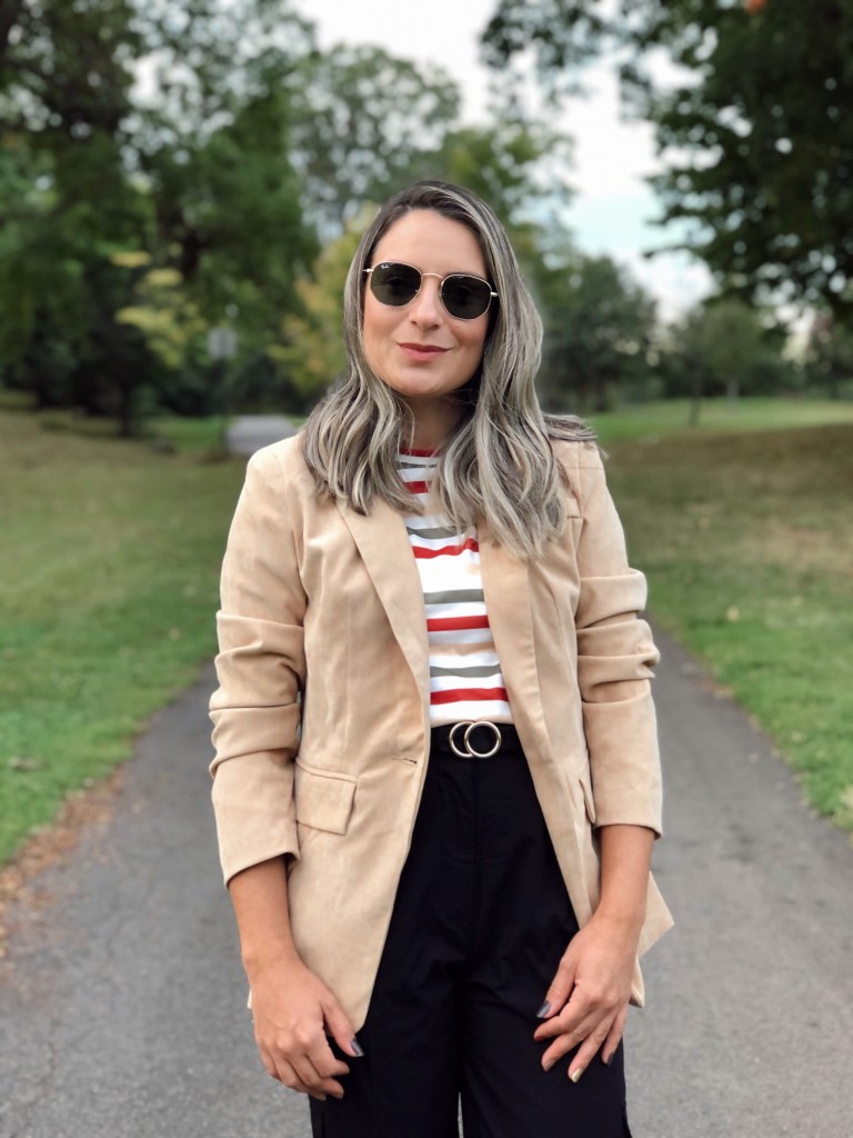 Have the leaves started falling where you live? Here it is starting now and I love how pretty it gets! All the changing color leaves make the perfect background for a cute fall outfit. And talking about one, I love how this simple Shein outfit is perfect for the season. Its my favorite combo: high waisted pants, tucked in tee shirt and a cute blazer on top. How do you like it? I hope you all have a wonderfull weekend! If you are shopping on Shein, use code D2padoni to get 15% off any purchase.
