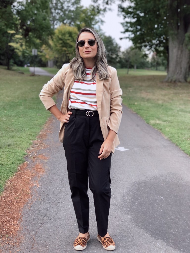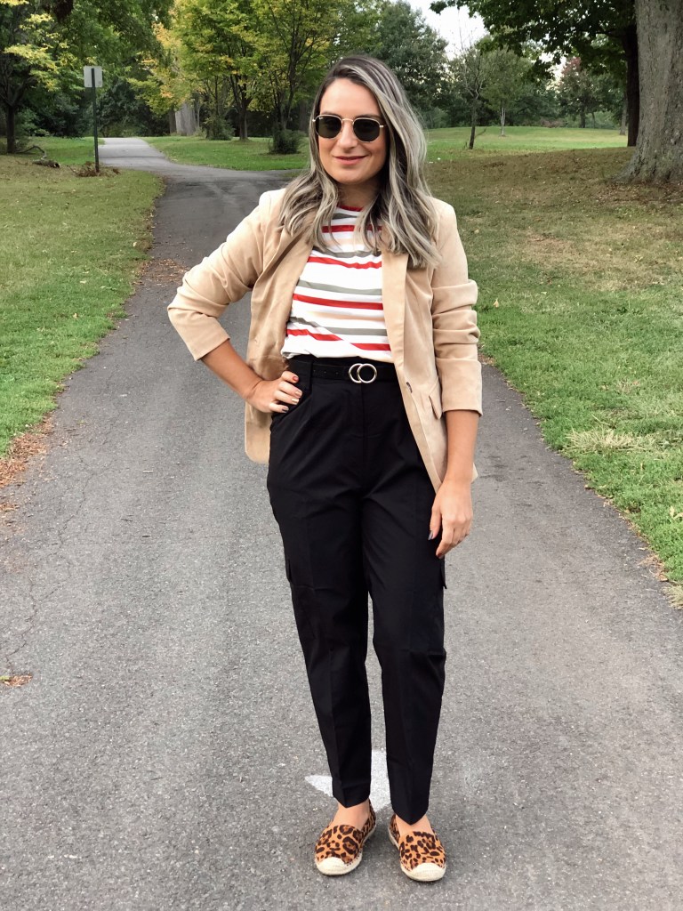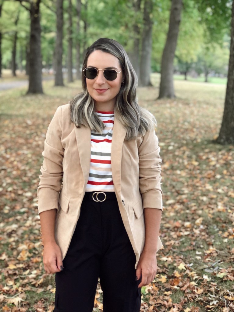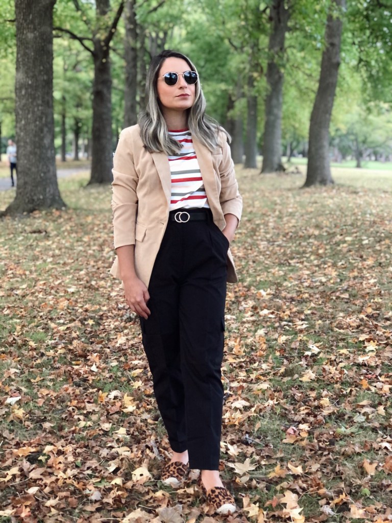Have the leaves started falling where you live? Here it is starting now and I love how pretty it gets! All the changing color leaves make the perfect background for a cute fall outfit. And talking about one, I love how this simple Shein outfit is perfect for the season. Its my favorite combo: high waisted pants, tucked in tee shirt and a cute blazer on top. How do you like it? I hope you all have a wonderfull weekend! If you are shopping on Shein, use code D2padoni to get 15% off any purchase.