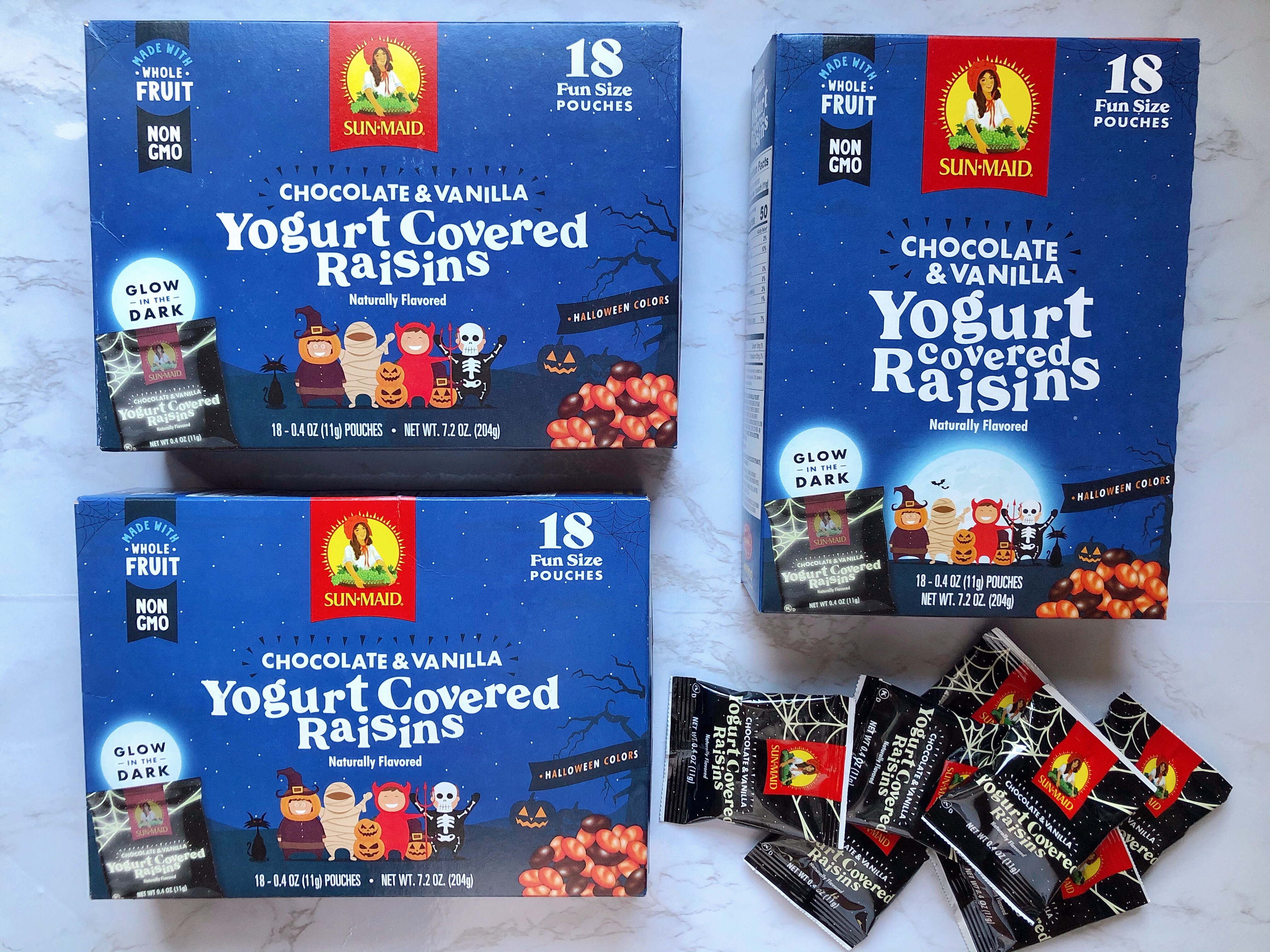 The new limited- edition Sun-Maid Chocolate & Vanilla Yogurt Covered Raisins with special glow-in-the-dark packaging is available for purchase via walmart.com in a special variety pack that includes 18 fun size pouches for $5.99.