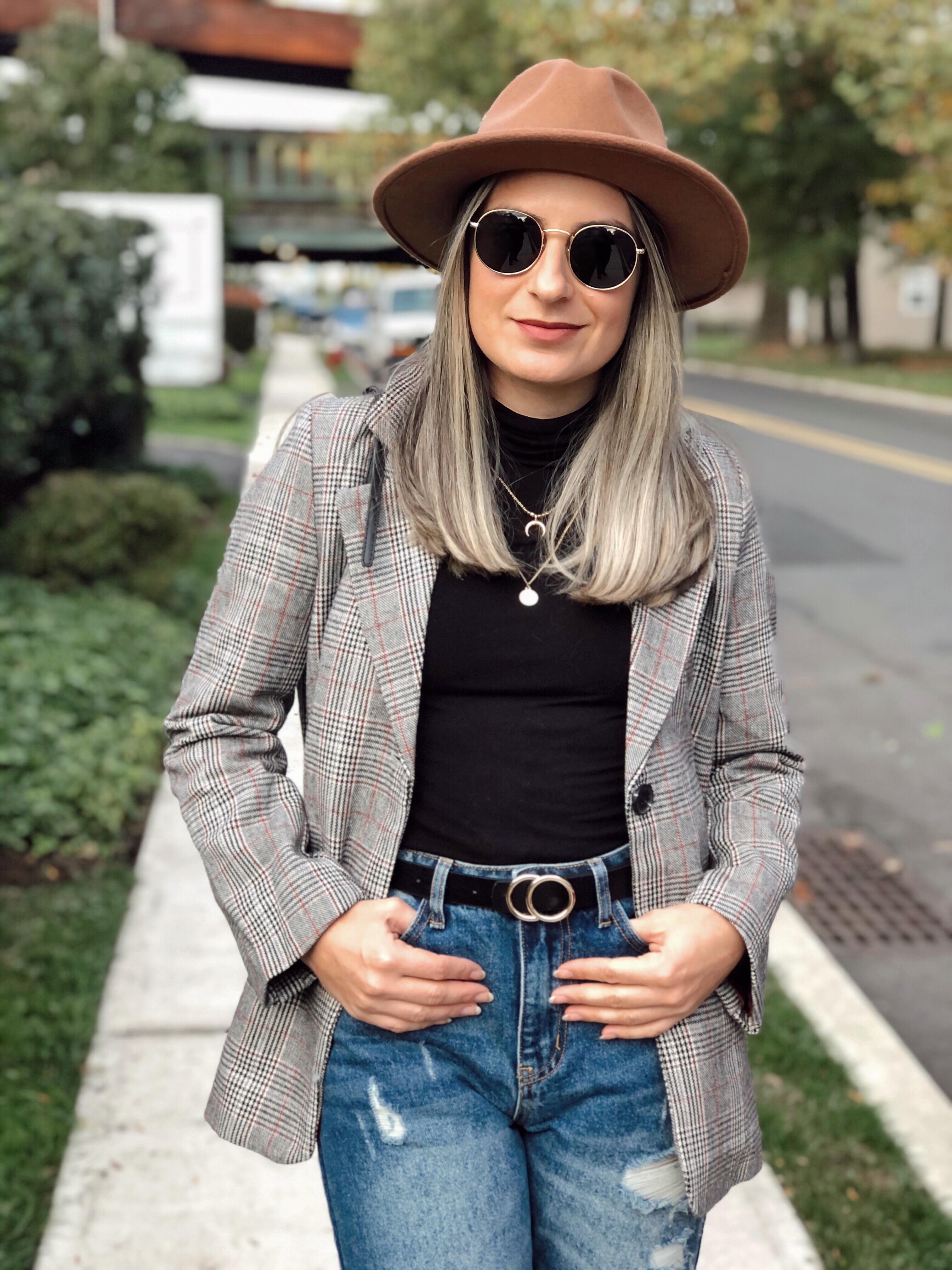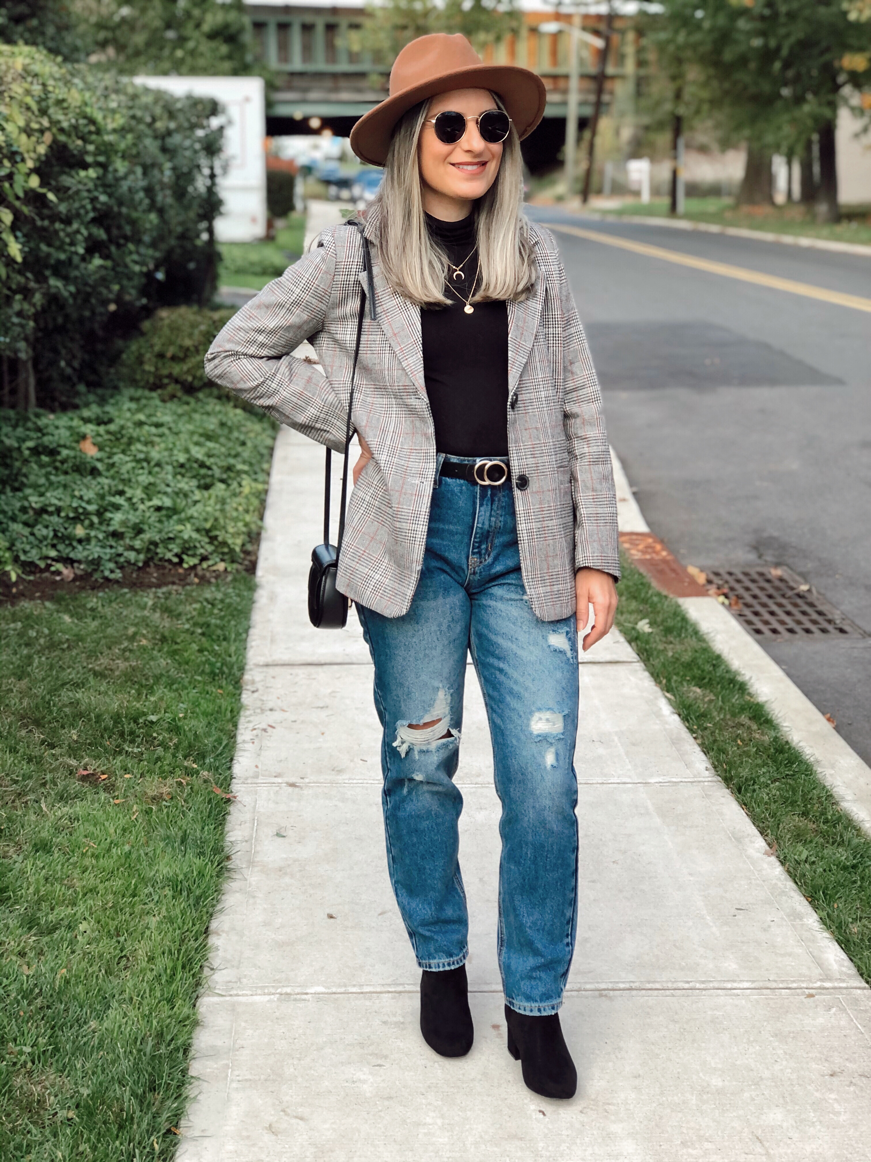 It’s been a long week! Elections going on here in the USA and everyone waiting anxiously for the results. Thank God the weather has been beautiful and the sun is shining most days. At least we get to leave the house and go outside with the kids! I really miss dressing up and choosing cute outfits but lately I have to confess I have been living in my sweat pants and tee shirt lol. But yesterday I decided to put something extra and make my casual outfit pop a little bit. I added this beautiful plaid blazer to my basic mom jeans and tee outfit. I love blazers and how you can wear it up or down. I wore booties and a cute hat to make it more fun. The mom jeans is also a new passion. It dresses so well plus its comfy and looks so good with the high waist cut. Both pieces, blazer and jeans are from Shein. If you are shopping there anytime soon, use my code D2padoni to get 15% off your purchase.