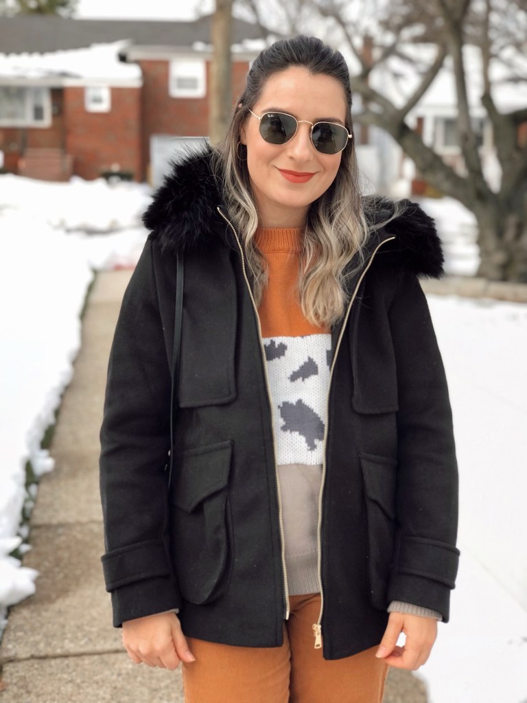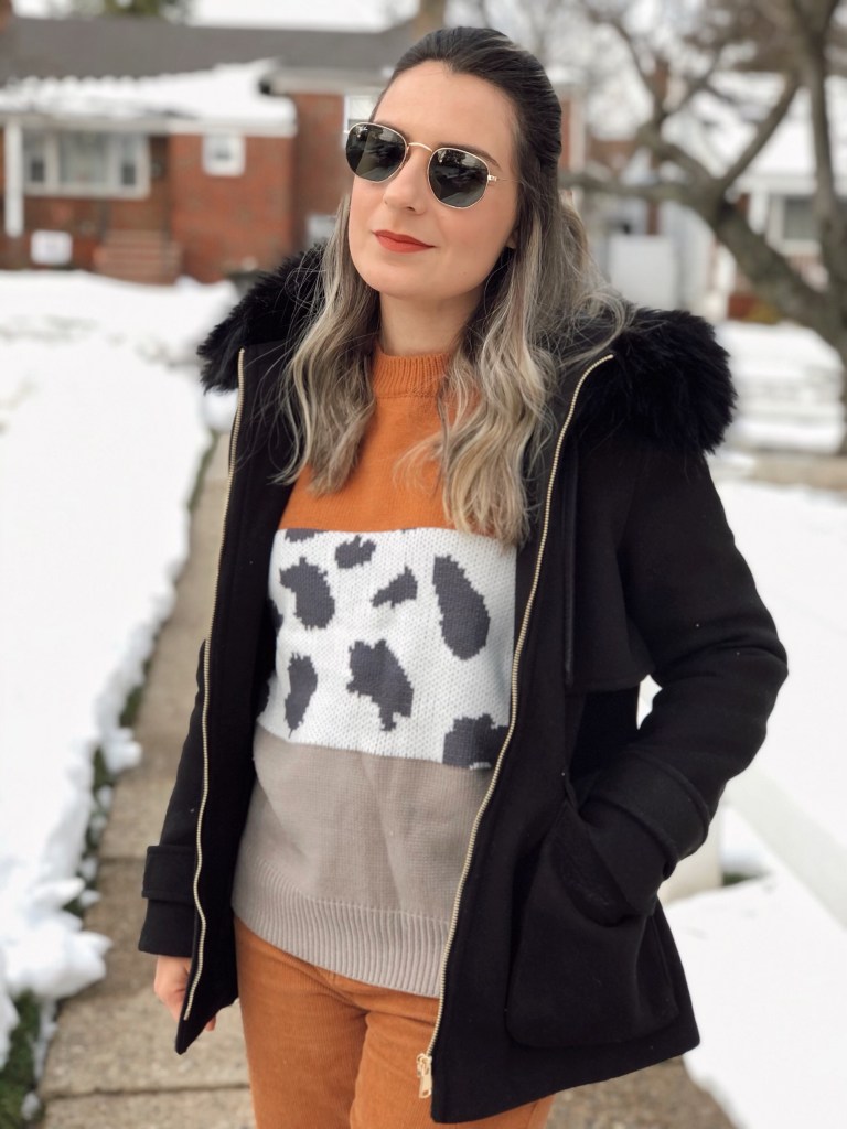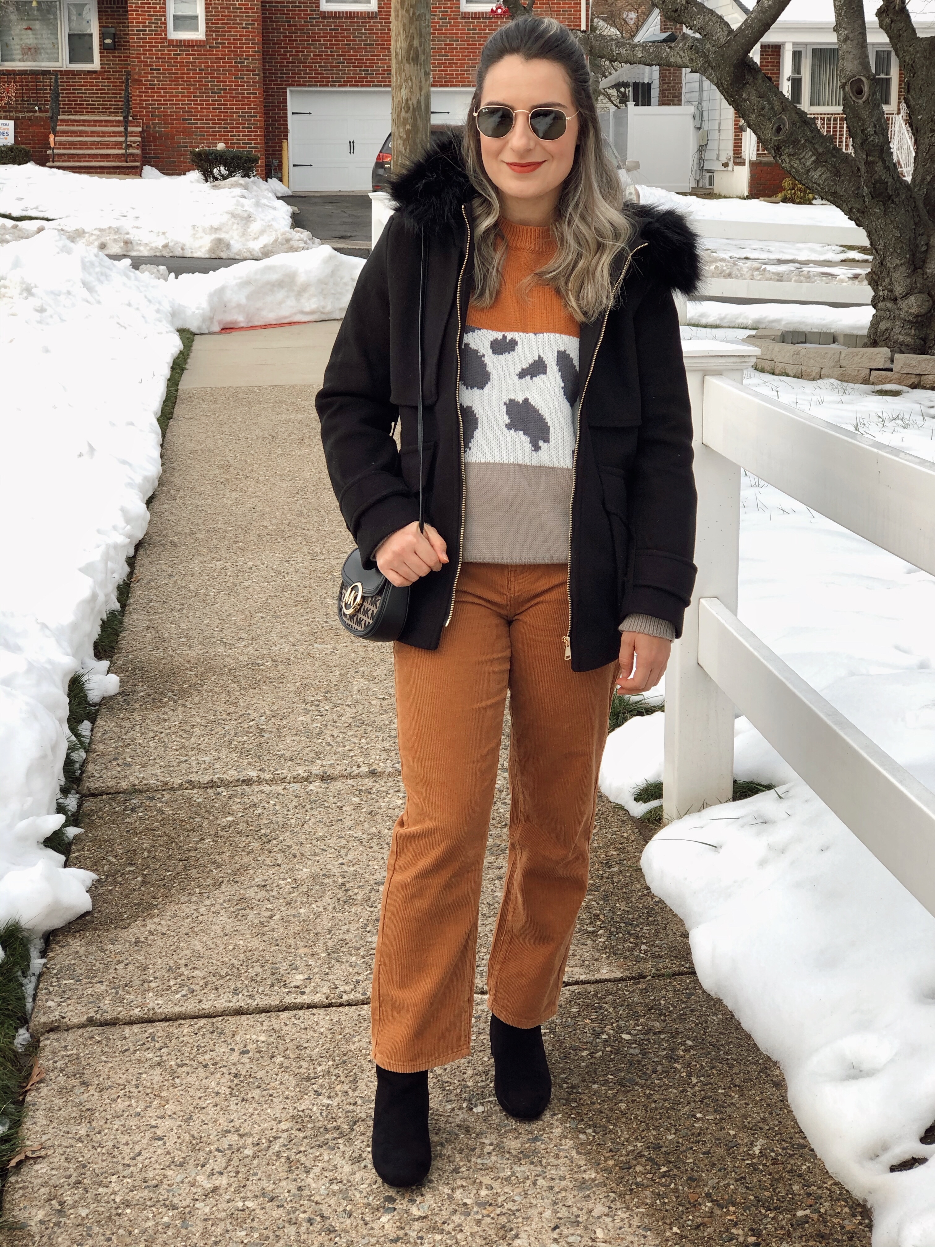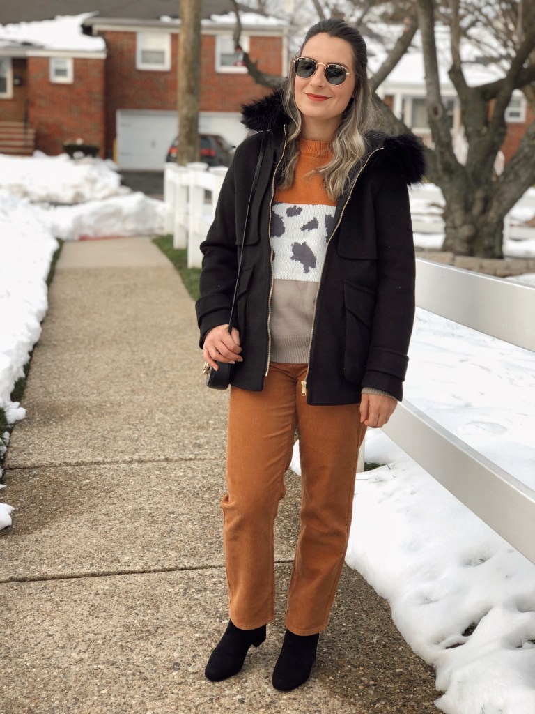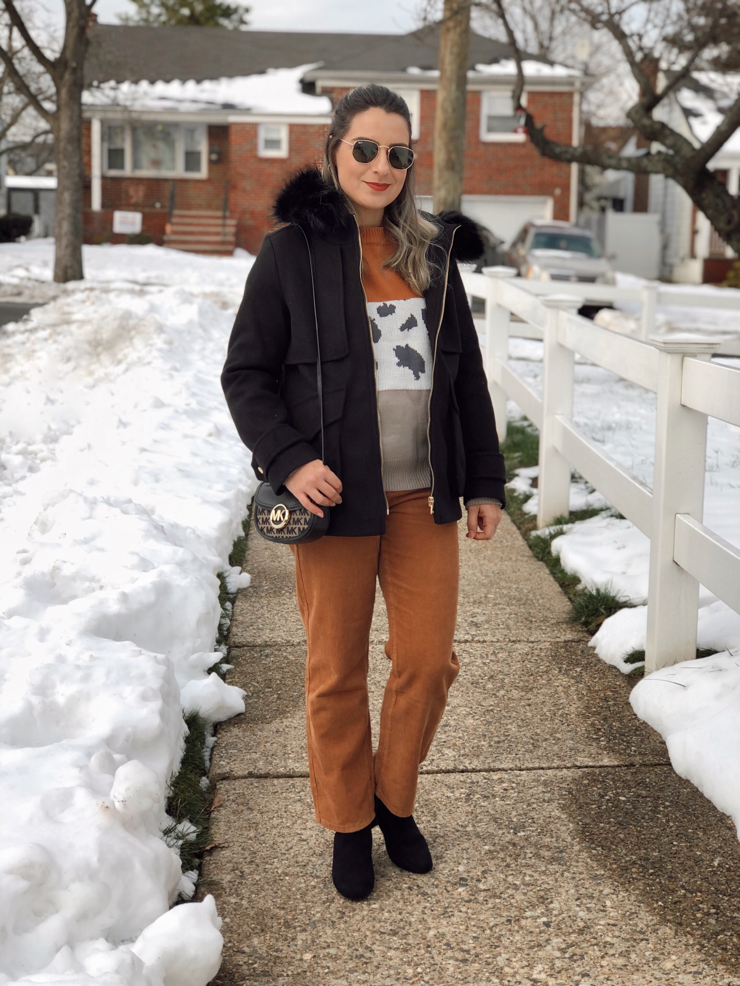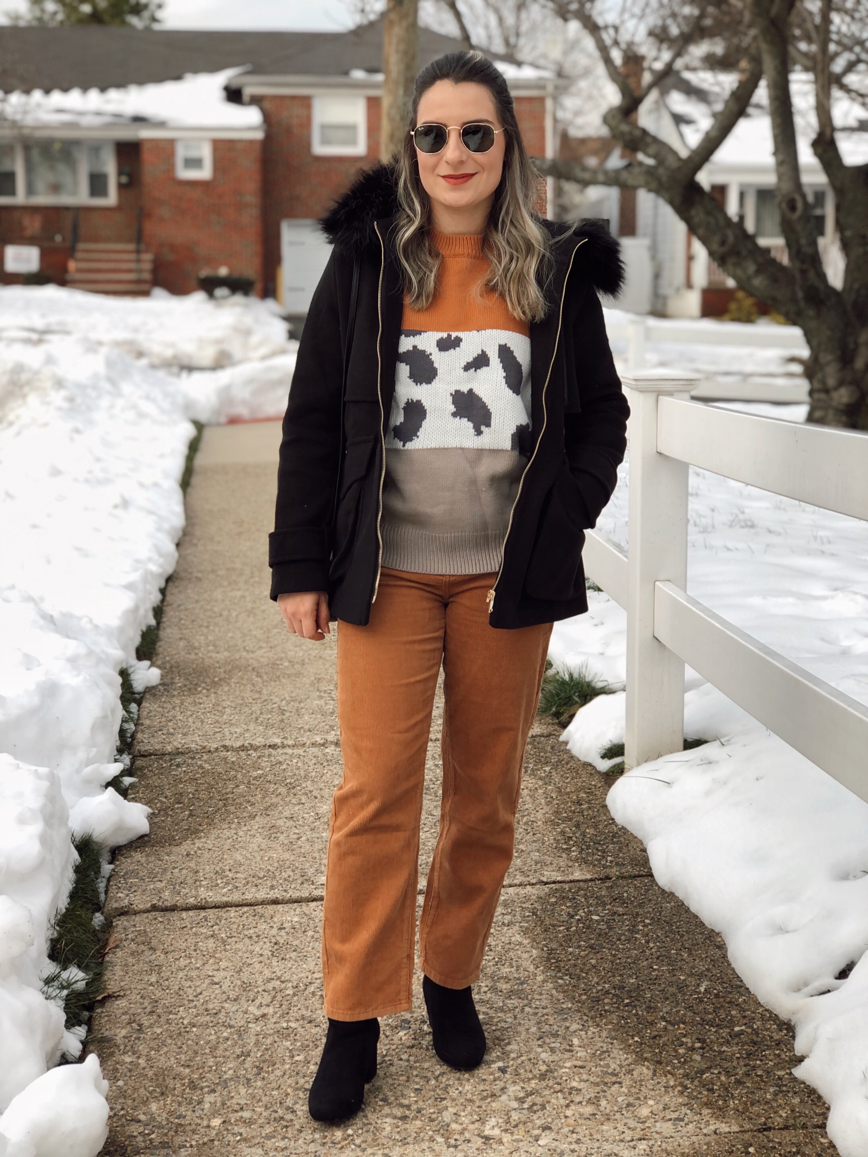 How is your holiday break going? This year was a different one for many of us, but trying to stay positive and see the good in all things help. I have been spending a lot of time with my husband and kids and we are trying to make the most of this Christmas season. Although this xmas I did not dress up and opted for pajamas, I wore some cute outfits the days before while doing my Christmas shopping. I am particularly in love with these high waist cropped corduray pants. Its very warm and dresses so cute. Its also on sale for $14 on Shein site. I paired with this adorable sweater which the colors go very nice with the pants and I wore with this warm faux fur hood coat. Everything is on sale on Shein and you can get an extra 15% off using code D2padoni.