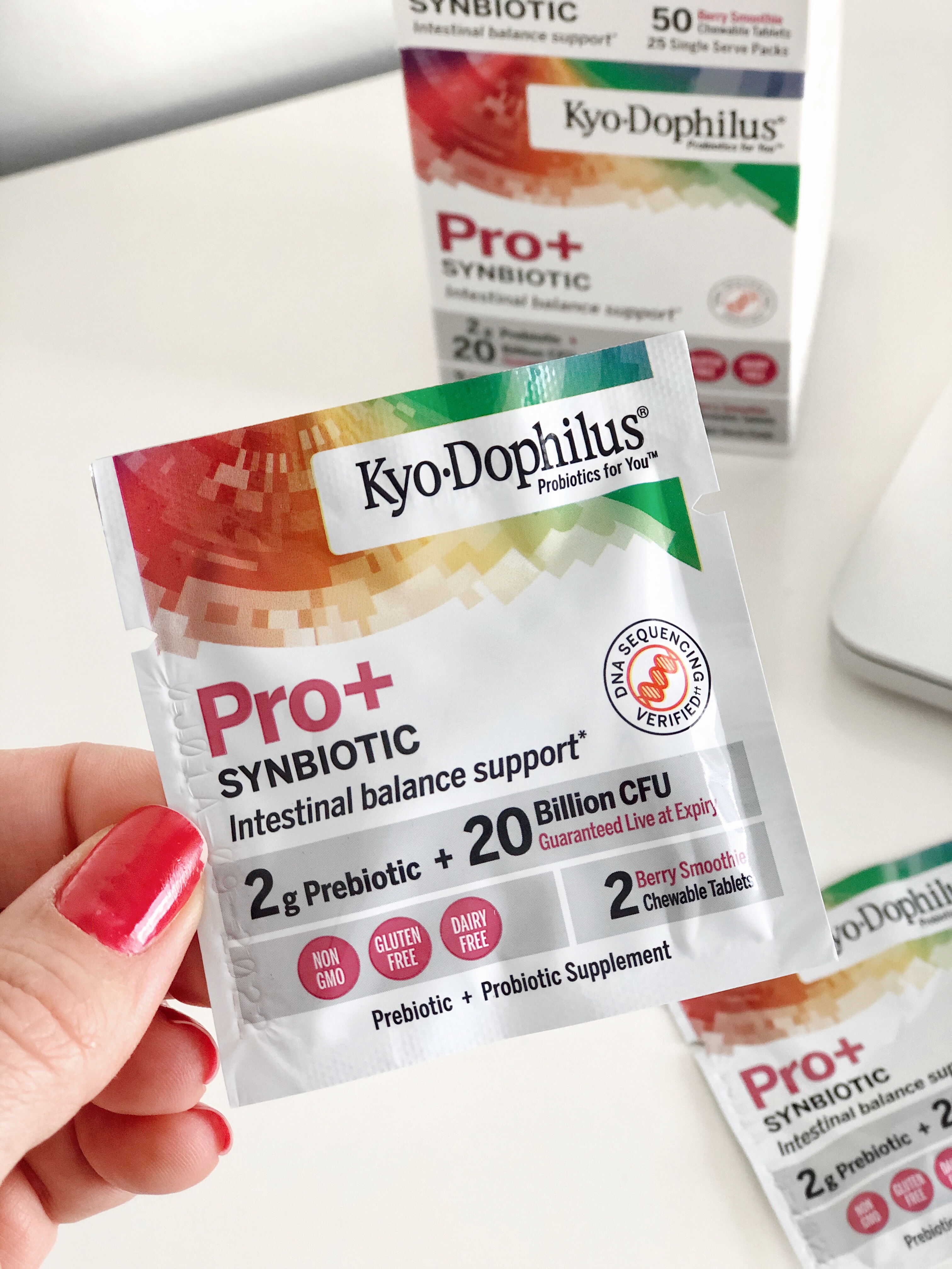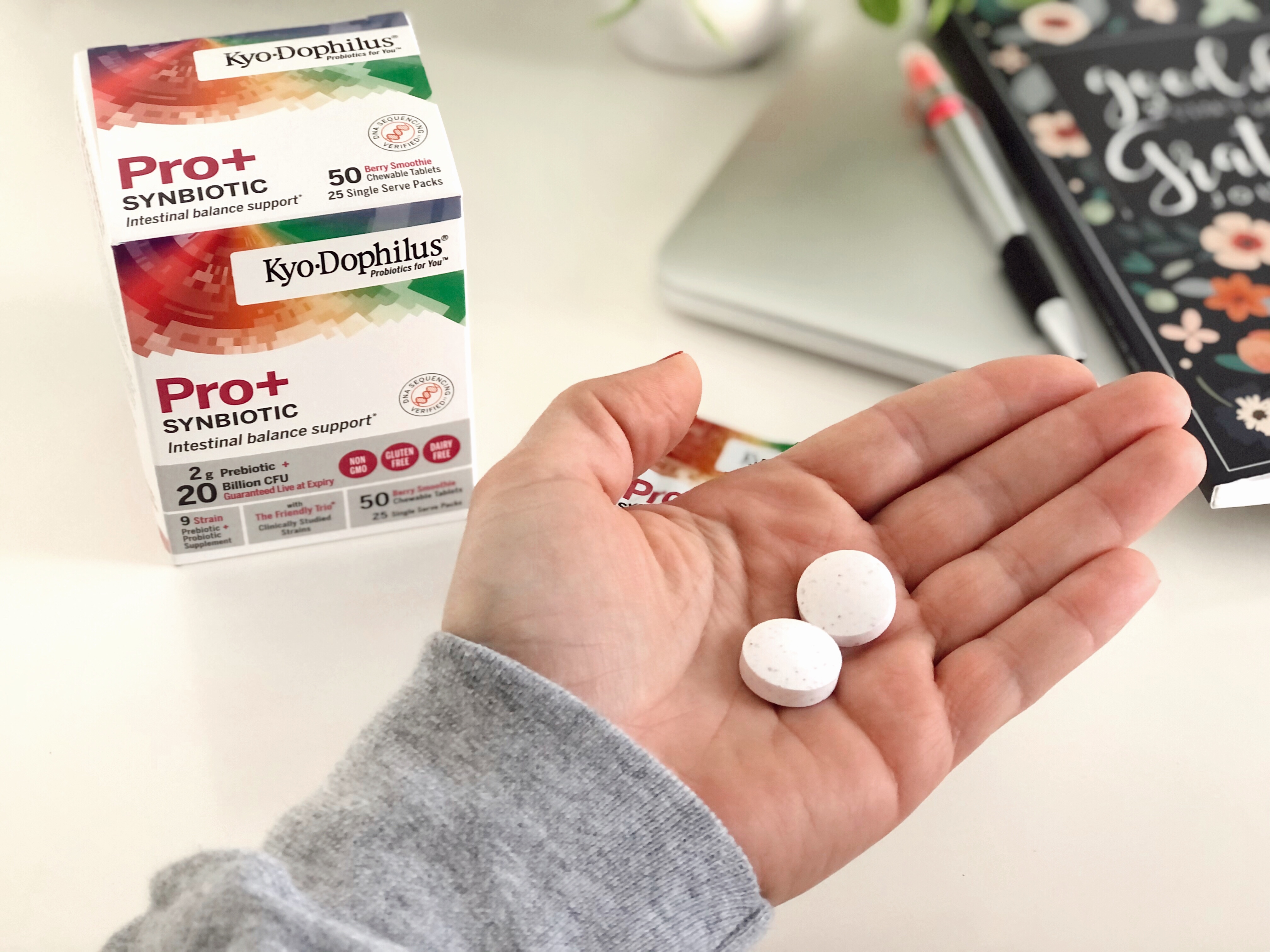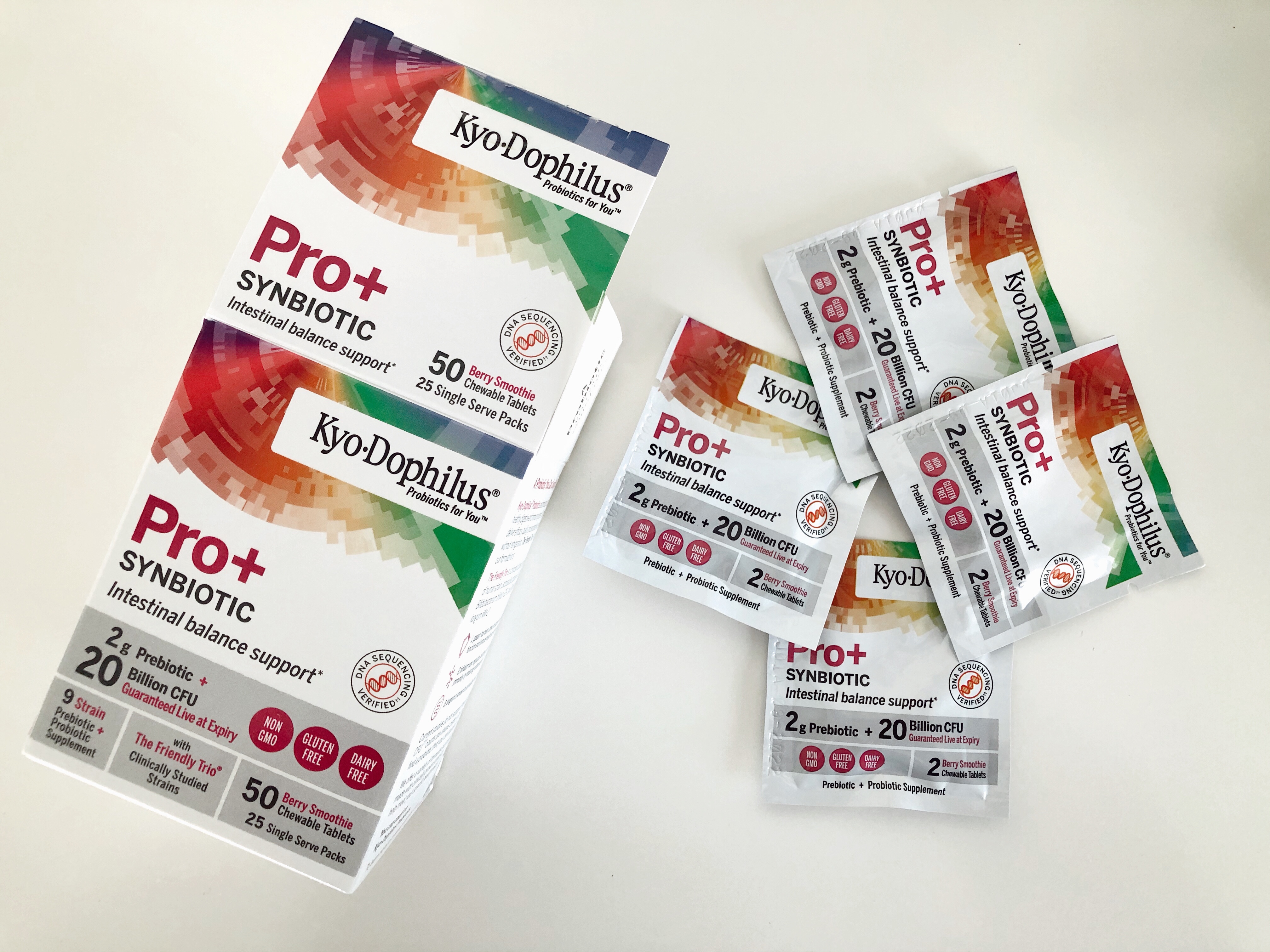 - Kyo-Dophilus Pro+ Synbiotic comes in tasty chewable tablets that contain a specially selected prebiotic and a community of nine probiotic strains.