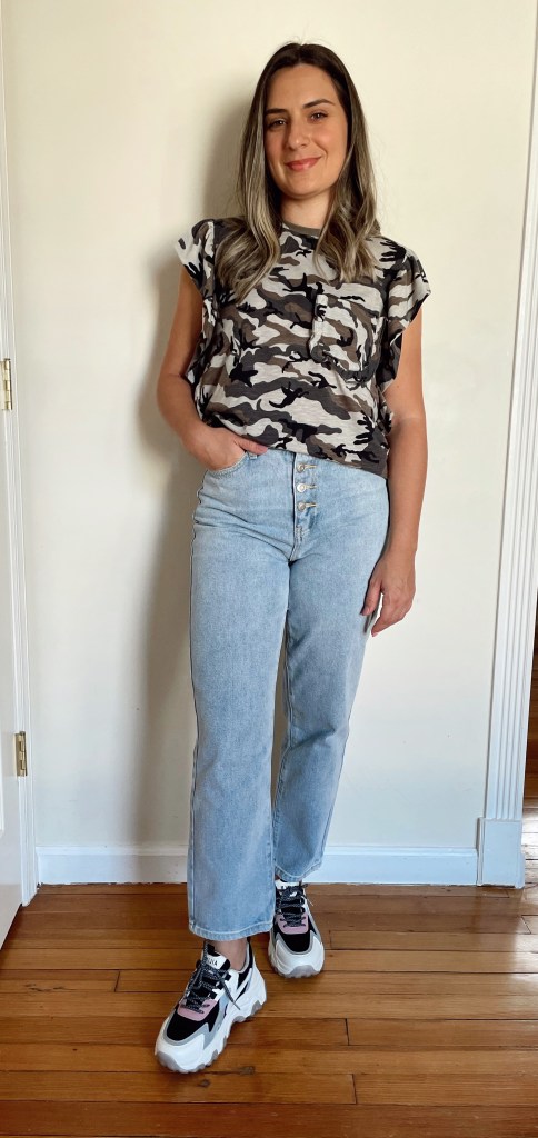 And lastly, I’m loving this camo print for spring. The sleeveless tee with ruffles around looks super cute tucked inside and with chunky sneakers.