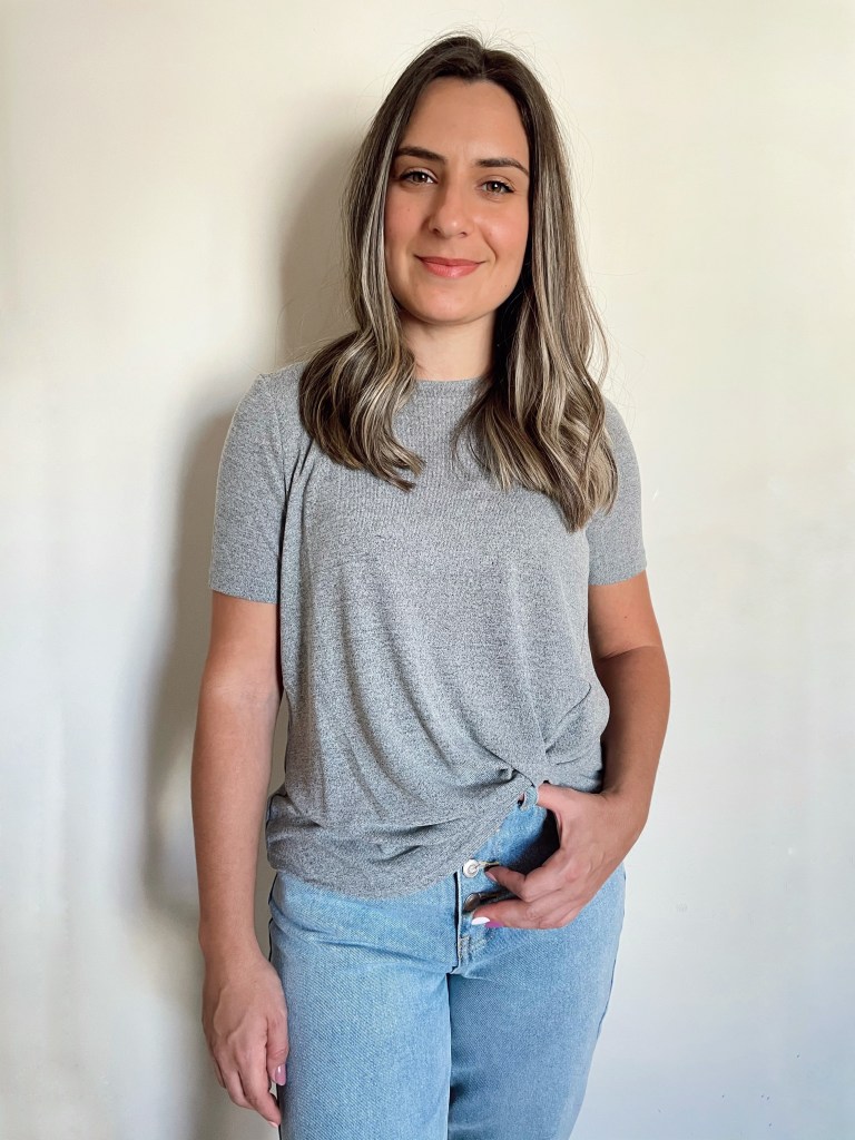 O segundo look é bem básico com camiseta cinza. Essa camiseta tem detalhe mais curto de um lado então deixei por fora mesmo.