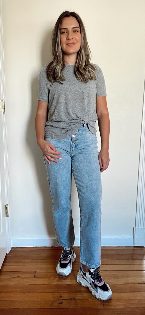 The second look is very casual and easy. I picked a plain grey tee that has just a little detail on the bottom. Since one side is shorter I didn’t have to tuck it.
