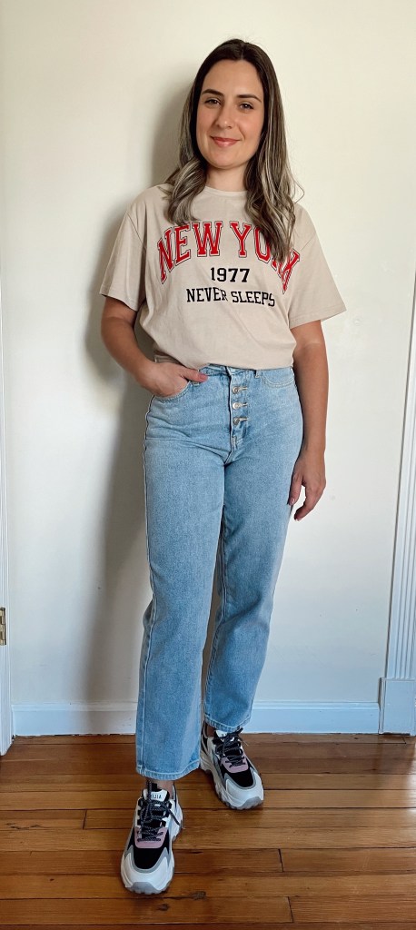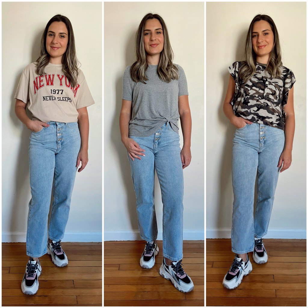 I particularly love this trend and I think if you follow some tips it can work with your wardrobe and look age appropriate. Have you tried this trend yet? Today I wore this straight leg jeans from Shein with a chunky sneaker. I paired with 3 different tops so you guys could get the idea.