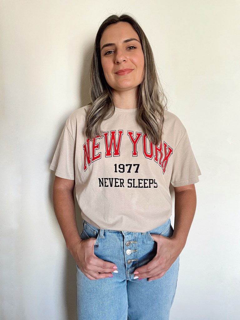 Para o primeiro look escolhi essa camiseta NYC. Ela é grandona e coloquei por dentro.