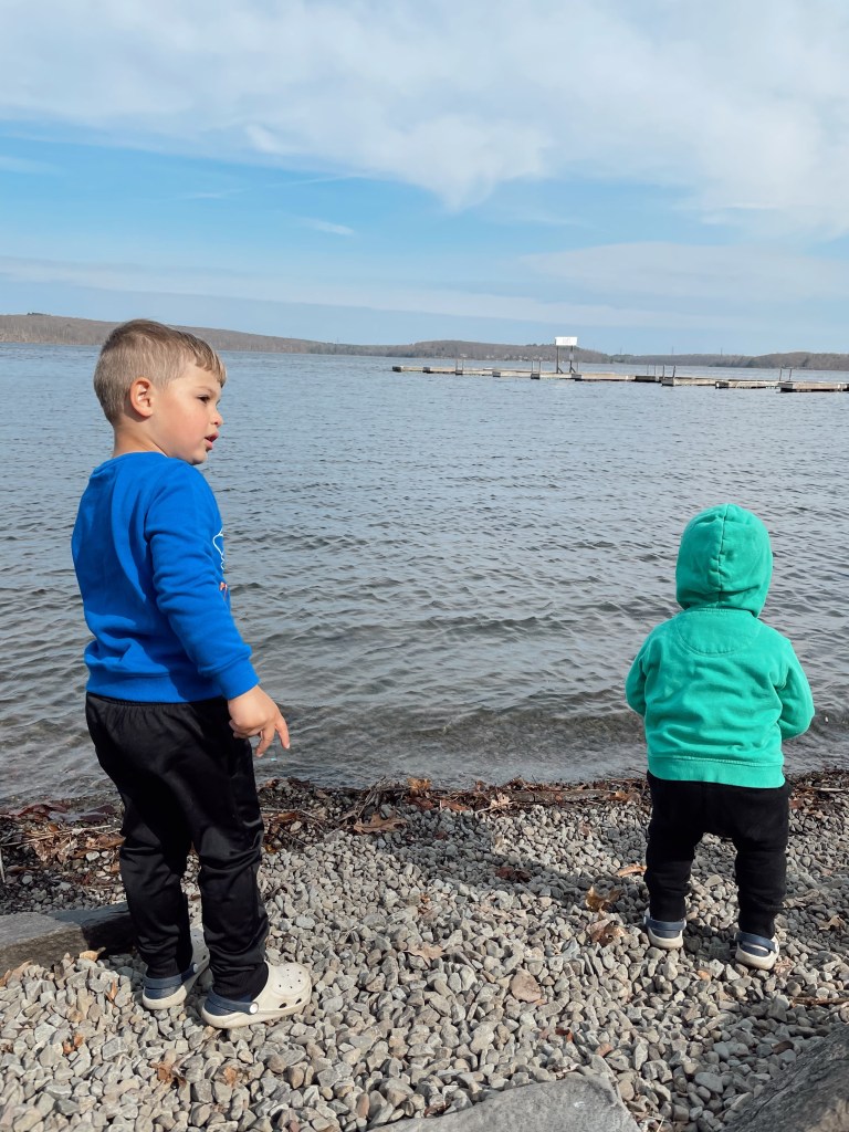 Also if you are looking for a place to eat, they have their own waterfront restaurant called The Dock on Wallenpaupack. They have both indoor seating and deck dining that serves delicious meals. I was glad they also had many kid-friendly options and the pizza was delicious. Because of the current circumstances we don’t feel comfortable dining out with the kids because they don’t stay still and touch everything, so we order takeout and it was perfect to eat on the benches by the lake or by the fire pit lounge.