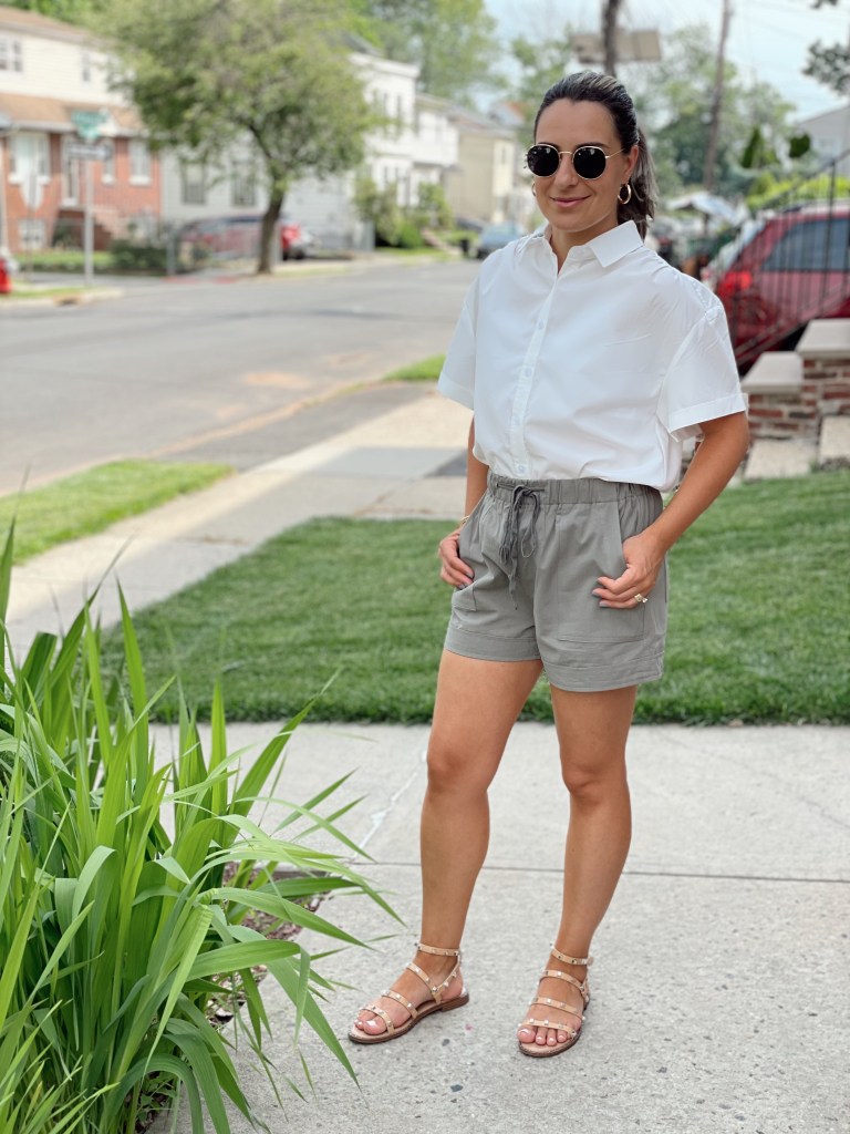 For the second outfit, I decided to go a little more dressy but wanted something easy and not overdo. I paired the shirt with a wide leg short and a cute studded strappy sandals. Put my hair up for a fun, fresh summer look.