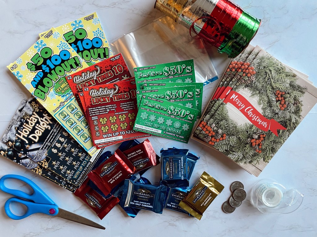 While the tickets are beautiful and festive on their own, I like to take one step further on something as simple as just putting the scratch-off tickets in a plastic bag with a holiday card and chocolate to make it feel a bit more special. Also as a finishing touch, I always tape a coin with it so the recipient can easily scratch off their tickets.