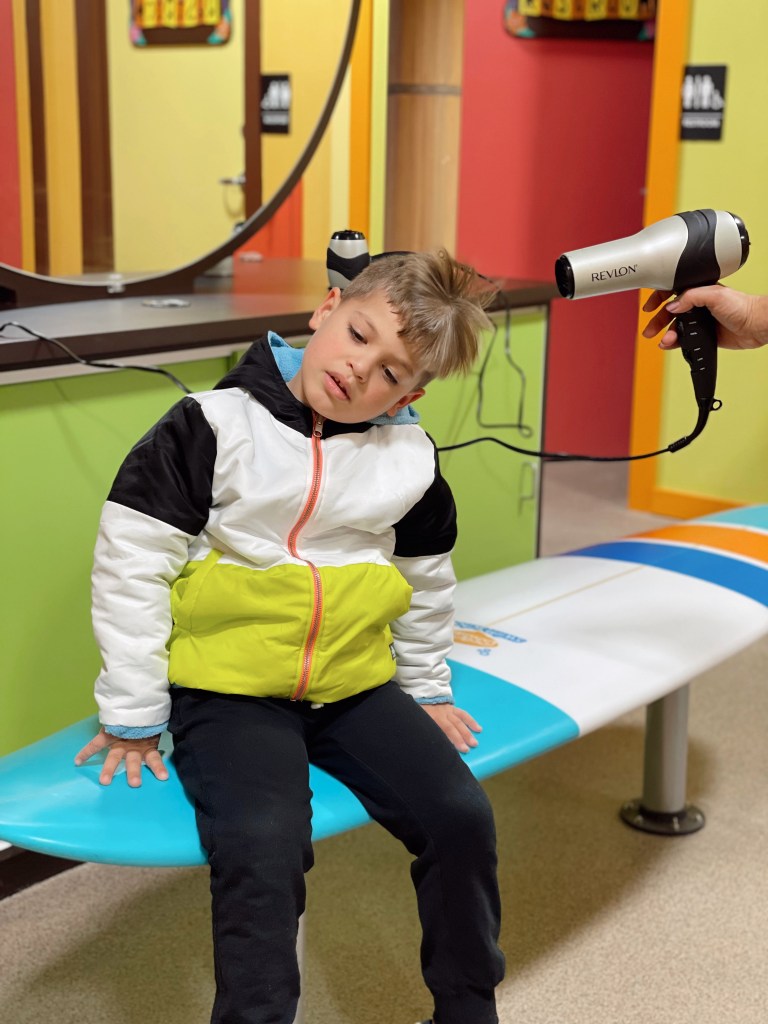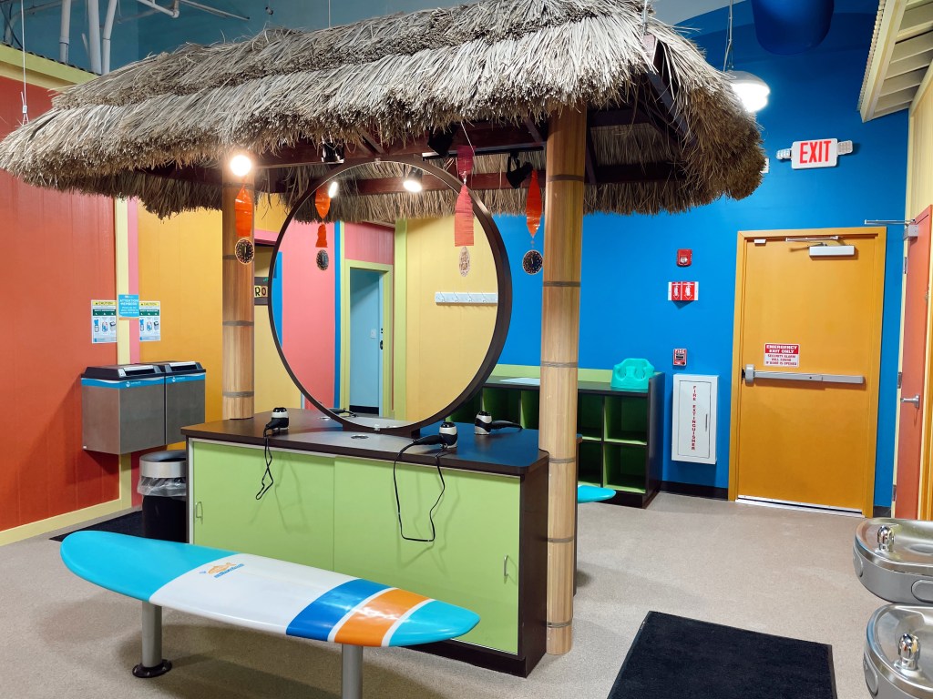 After changing, you can use the dry bar to dry kids hair. This is especially helpful in the winter, so you don’t have to go out in the snow with wet hair! They have an adorable setup with a surfboard for the kids to sit while you dry their hair.