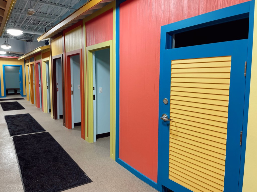 Then you head to the dressing rooms which have fun colored doors, adding to the vibrant atmosphere. There’s a little bench inside where you can set your bag and hooks where you can hang towels or wet suits when changing.