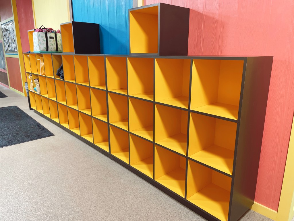 There are easy-to-reach cubbies that allow kids to storage their belongings independently.