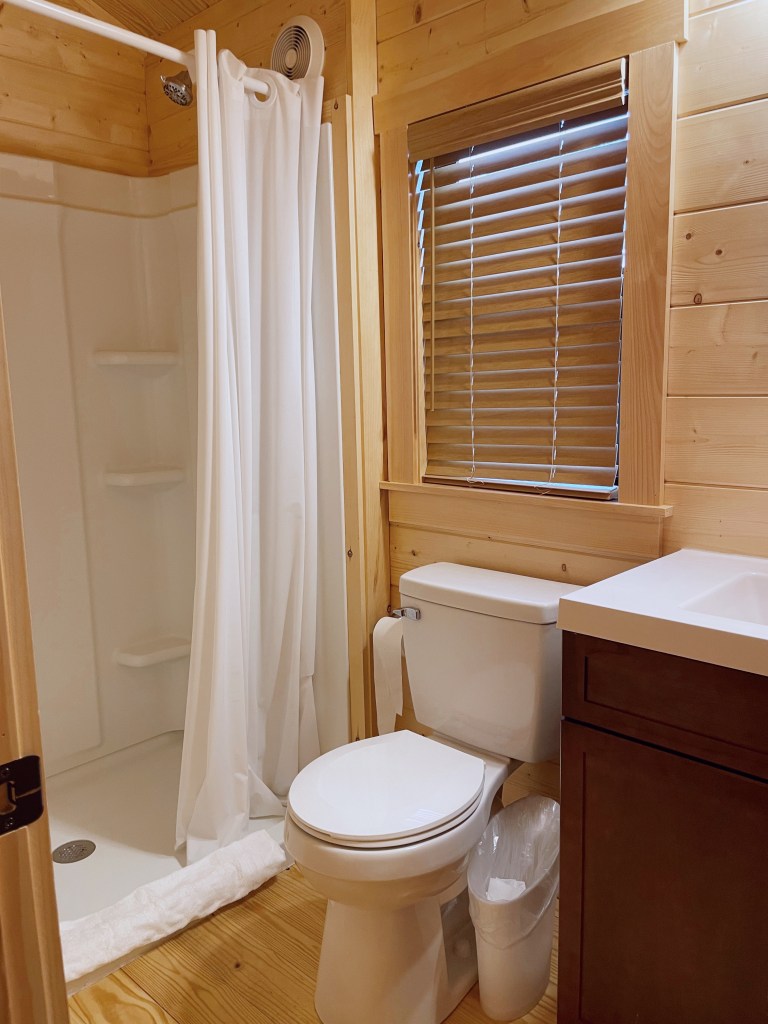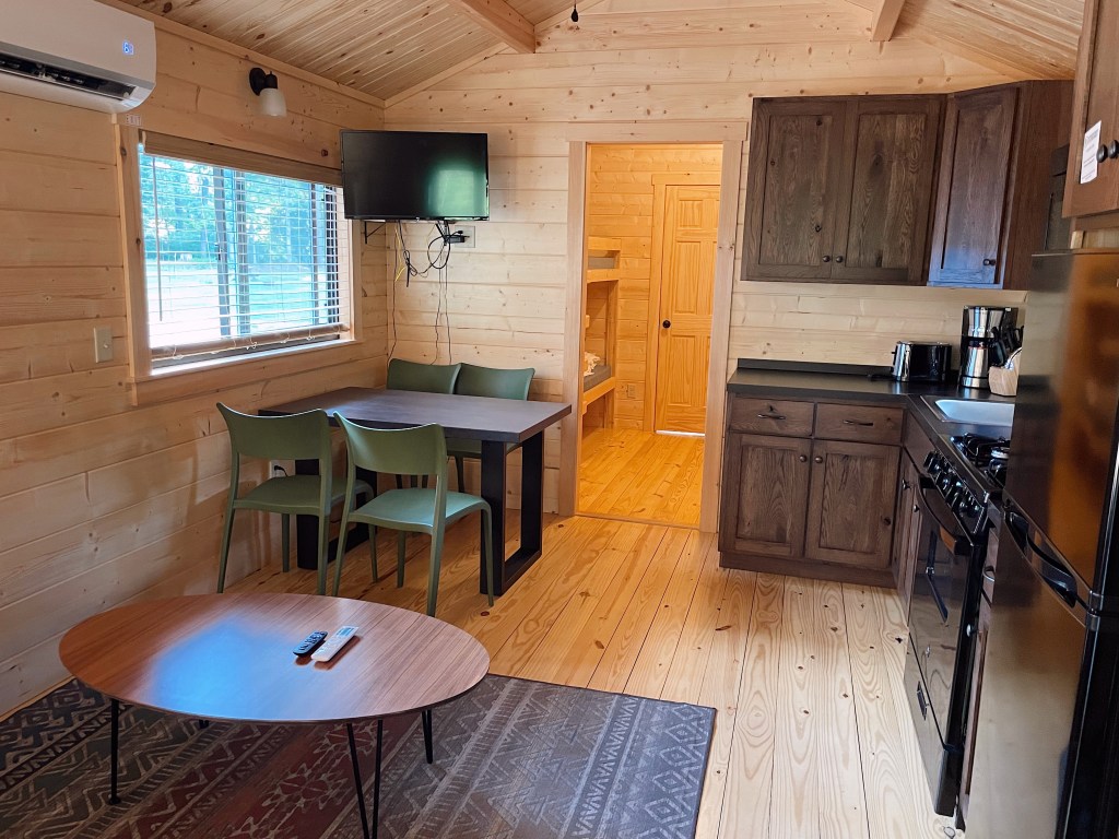 The Evergreen Riverview cabins are beautiful and cozy and offer the benefits of camping without the hassles and inconveniences of sleeping in a tent. Our cabin had all the luxuries we love- full kitchen (with oven) and stocked with all the kitchen basics like coffee maker and toaster, full bathroom with nice and hot shower, A/C and heat, a comfy Queen sized bed and bunk bed for the kids (sleeps up to 6), TV in the bedroom and in the living room, a charcoal grill, fire ring and a picnic table.