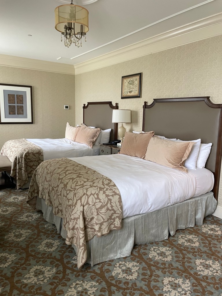 We stayed at a two queen sized beds room. Everything was clean and had the charm of the 1930’s. We also had a beautiful view of the garden and the fountain lake.