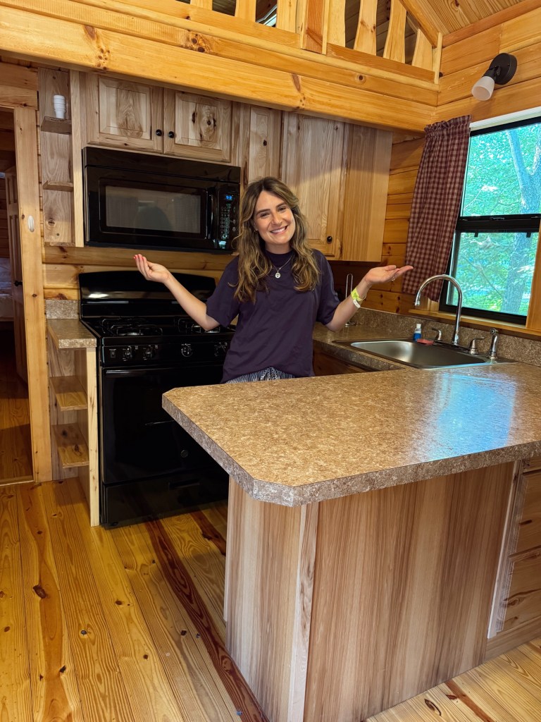 We always stay at the Trailblazer cabin. It’s so spacious and feels perfect for our family. It includes a separated bedroom, bunk bed, loft area and full bathroom, with sink, toilet and shower/tub. It has a kitchen with oven, refrigerator, microwave, coffee maker, toaster, pots & pans, dishes, silverware, and more!
