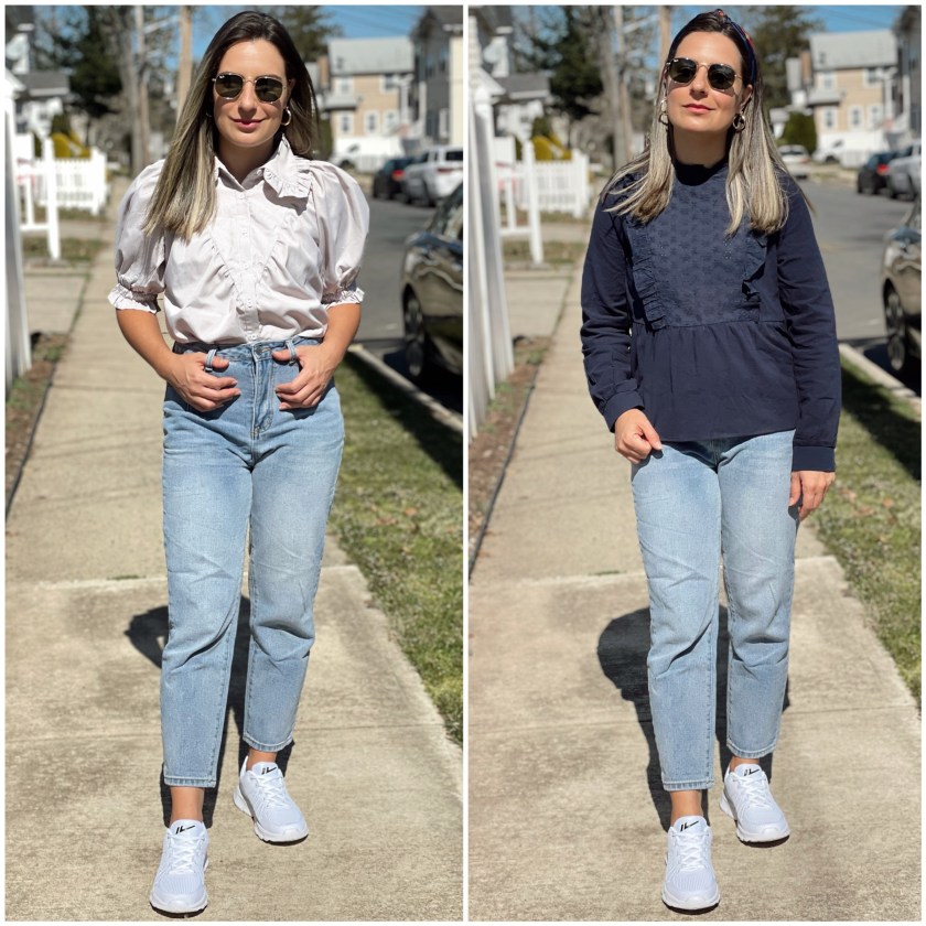 A few years ago I would never wear jeans with sneakers let alone with a dressy top. Sneakers were for gym or a very sporty outfit. Thank God for the sporty sneaker trend. I’m loving to pair it with different styles like dress, skirts and even jeans. For today outfits I put out two cute options with dressy tops and jeans. A alguns anos atrás eu jamais usaria calça jeans com tênis esportivo. Ainda mais com uma blusinha mais arrumadinha. Resumindo o tênis era somente para academia ou um look bem esportivo. Mas graças a tendência de tênis com tudo meu conceito mudou! Estou amando explorar várias opções de looks usando tênis. E para os dois looks que separei pra hoje, estou usando a mesma calça jeans mom style e o tênis branco super leve e confortável, só mudei as blusinhas. The first outfit I picked this dressy button down shirt and tucked inside mom jeans. The white sneakers gave a cool finish to the outfit plus I was super comfy and able to play …
