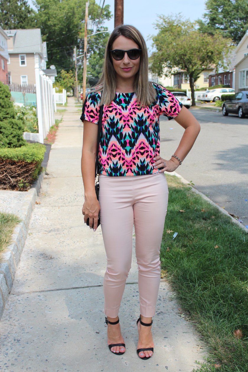 Bom dia flores do dia! Seja bem vindo Setembro! Nem da para acreditar que ja estamos no mês do meu aniversario! O tempo esta passando rápido demais! Ai ai….. 🙂 Bom, hoje vim mostrar um look bem simples com toque de cores que é perfeito para o verão. Usei esse look no domingo para ir na igreja e depois almoçar. Escolhi uma calça em tom salmão pastel, e para deixar o look mais alegre, coloquei um top todo trabalhado na estampa colorida. Finalizei com sandália, bolsa e óculos preto deixando o look mais sofisticado. Vamos ver? Espero que tenham gostado dessa produção. Calça: H&M Blusa: Marshalls Bolsa: Marshalls Sandália: Mandees Óculos: RayBan Erika