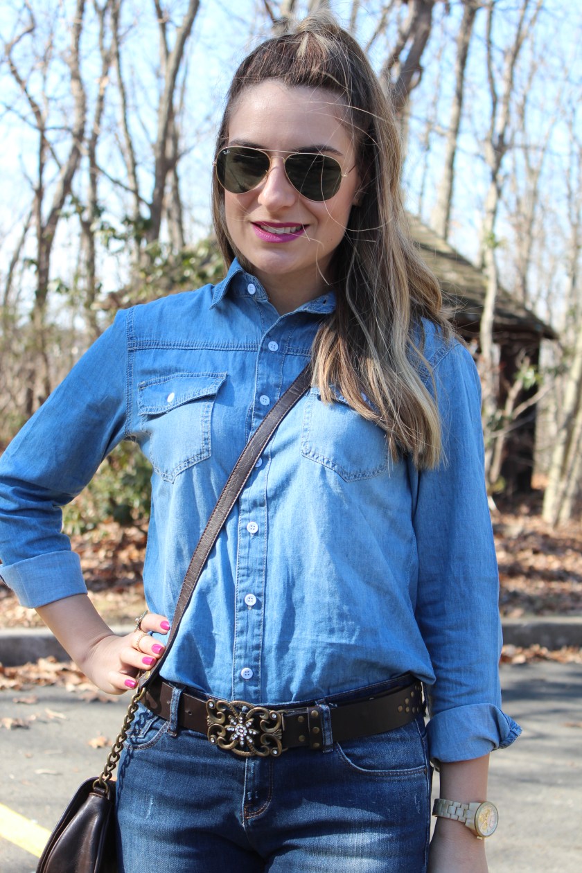 Bom dia girls! Hoje vim compartilhar um look jeans total, uma produção que eu adoro e sempre uso. Aproveitei que ontem deu uma esquentadinha para estrear a minha Camisa Jeans linda que recebi da Shein. Adoro misturar texturas e lavagens diferente de jeans e acho que a combinação de calça e camisa fica super democrática e combina com diversas ocasiões. Para esse look usei uma calça jeans de lavagem mais escura com desbotado mais claro nas pernas e finalizei com acessórios estilo “western”…. Cinto marrom mais grosso, bota de salto grosso e bolsinha marrom tira colo. Alem de super versátil, ficou mega confortável! Vejam só: Gostaram desse look jeans total?   Camisa Jeans: Shein  Calça: Zara Bota: Soda Bolsa: Aldo Óculos: RayBan Relógio: Michael Kors Cinto: Sem Marca