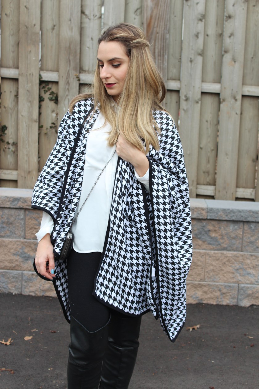 Bom dia amores! O look de hoje traz uma tendência que predominou no inverno 2016: a estampa conhecida aqui nos EUA como Houndstooth ou Pied-de-Poule, a famosa padronagem de pés de galinha. Essa estampa não é nenhuma novidade no mundo da moda, mas na ultima temporada tem sido muito usada pelas fashionistas de plantão! Para quem gosta de um look P&B (preto e branco) e esta em busca de inovar o look de uma maneira legal, super recomendo usar um item com essa estampa. Para esse look resolvi inovar e escolhi uma capa na estampa houndstooth bem inusitada e combinei uma calça legging preta com camisa branca de tecido mais fino. Usei bota acima do joelho e bolsinha tira colo para deixar o look mais charmoso. A capa é da Shein e super complementou o meu look preto e branco! Vejam: O que acharam dessa estampa? Usariam? Eu arrisquei uma capa, mas um blazer ou uma calça nessa estampa também ficaria top! Capa: Shein Camisa: H&M Calca: TJMax Bota: Charlotte Russe Clutch: CNDirect Batom: Cruella- Nars …