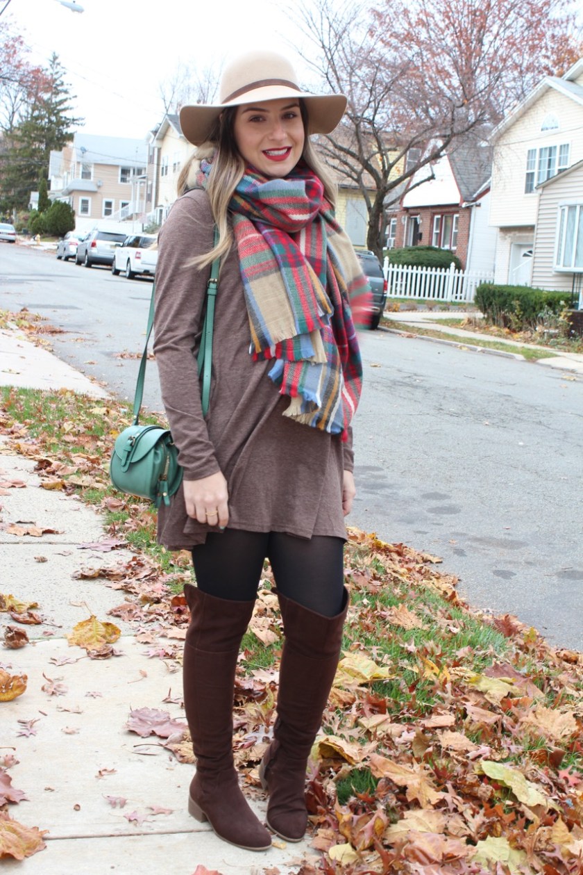 Bom dia meninas!!! Sabe aquele look super gringa com uma pegada fashionista e cara de outono!? O look de hoje está assim! Adoro essa época de outono/inverno para abusar nos acessórios como chapéu, lenços, cachecóis, toucas, etc…. E nada melhor que juntar conforto e tendência e criar um look estiloso né! A peça chave do look é esse T- shirt dress de manga comprida da Shein todo de malha que fica mais soltinho no corpo. Para dar um up na produção abusei nos acessórios que são super tendência do momento como esse cachecol oversized xadrez e chapéu! Usei uma meia preta e bota de salto baixo OTK. Um look bem casual e perfeito para uma tarde de Domingo! Agora durante a gravidez estou adorando usar vestidos e batas com leggging e bota 🙂 O que acharam desse look? E hoje completam 20 semanas de gravidez! Da para acreditar!? Ta passando muito rapido genteeeee. Vestido: Shein Bota: Charlotte Russe Cachecol: H&M Chapeu: Walmart Bolsa: Sammy Dress