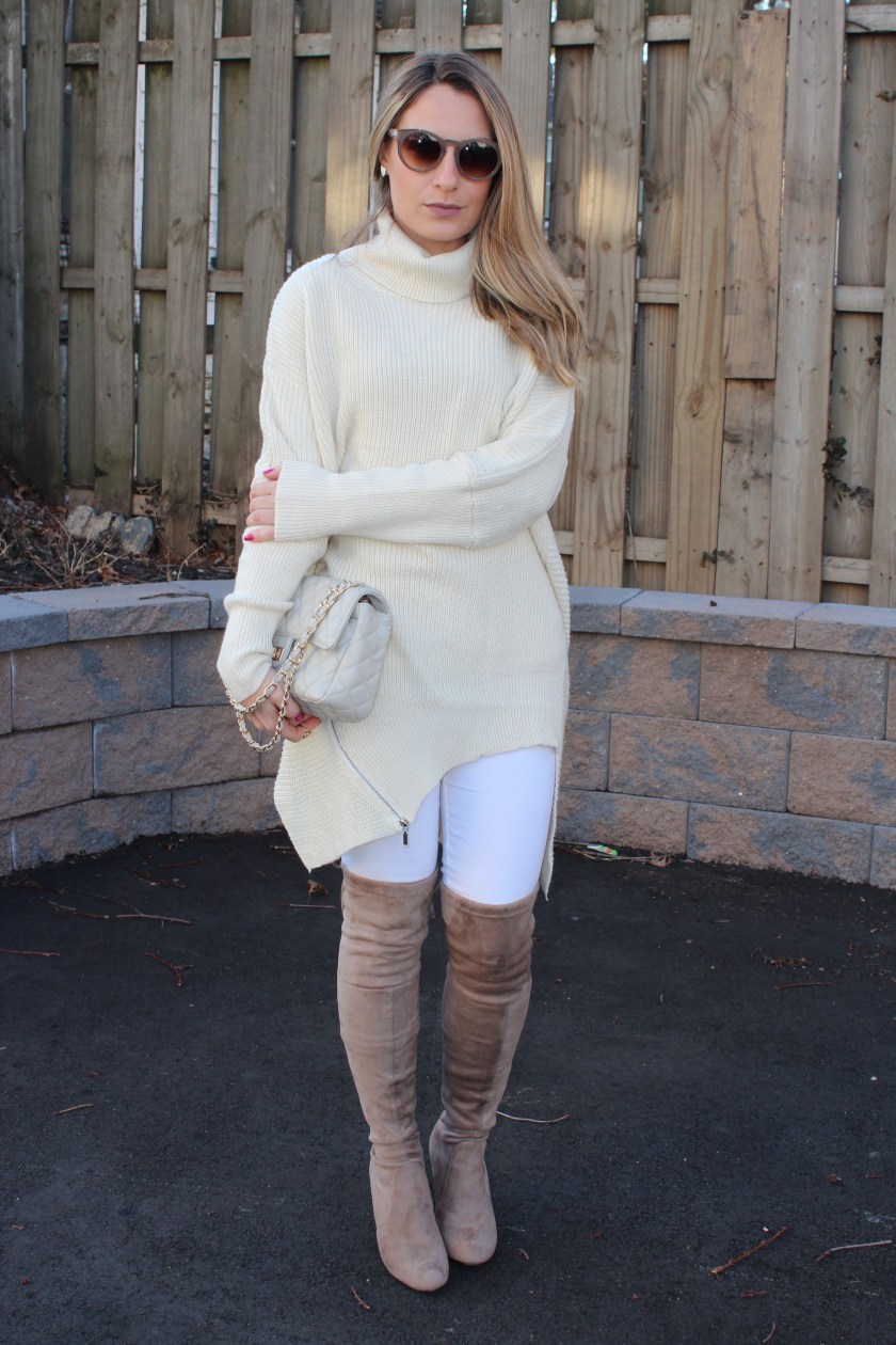 Oiii meninas!!!! Apesar de adorar roupas coloridas e com estampas diferente, confesso que meu guarda roupa é composto em grande parte de peças com tons neutros. Acho que essas peças clássicas são essenciais alem de deixar qualquer produção mais elegante. E isso vale para qualquer estação do ano! Inclusive, inverno não é mais sinônimo de roupas escuras, o branco e o bege, quando combinados na medida certa, podem formar uma linda composição invernal! E o look de hoje é super simples e neutro! Os dias continuam gelado por aqui, e nessa época do ano, simplicidade e conforto são palavras chave que procuro quando monto meus looks. Esse look usei no sábado para fazer as correrias do dia a dia e escolhi uma suéter “oversized” com detalhe de zíper na parte de baixo. Usei com uma calça branca skinny e finalizei com bota acima do joelho. Um look super simples, versátil e ao mesmo tempo com informação de moda. Vejam como ficou: Que tal? Suéter: Shein Calça: Mandees Bota: Soins Óculos: Forever 21 Bolsa: TJ Max