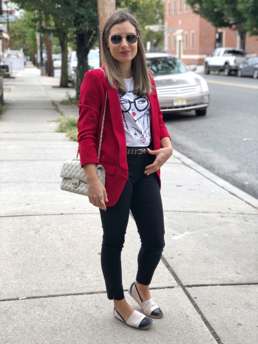 Hey guys! How was your week? Im very excited for this weekend as it is my birthday! 🙂 Its funny how after you become a mother and you turn 30 you dont really get too crazy about your birthday haha. I will probably just hang out with my husband and kid and go out for lunch or something. But anyway, today I just wanted to share with you guys my really cool outfit. It has everything I love in it: tee shirt, black pants, blazer and flats. I recently got this red blazer from Shein and I love it. It has a nice silhuette and its a bit longer so it dresses very well with jeans, leggings, dresses, you name it! I more it with a printed tee shirt and it looked so cute! Love this style! Oi meninas, Como foi a sua semana? Estou super ansiosa para esse final de semana pois é o meu aniversario! Apesar que depois que fazemos 30 e temos filho não é a mesma coisa. Hoje em dia ja …