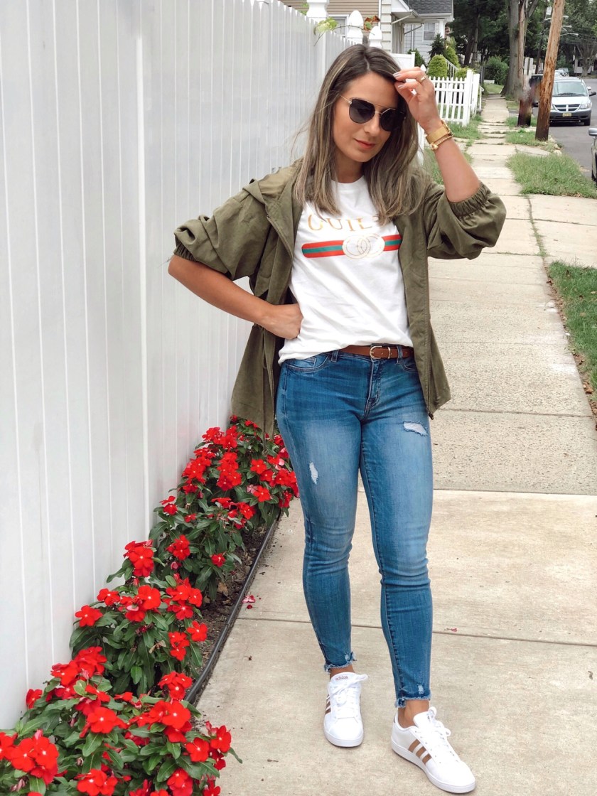 Hey guys how was your weekend? Here was cooler and we had to take our jackets out. Technicaly summer is not over yet, however we had two cooler days and it was cold enough to put our jackets on. So Saturday I went for a comfy sporty look wearing my favorite combo: jeans, tee shirt and sneakers. I choose some skinny ankle jeans with my simple white Adidas and got to use my Gucci inspired Guilty tee shirt from Shein with a drawstring whist hooded green jacket. I love the color of this jacket for the fall season. Look how cute it came out: Oi meninas tudo bem? Como foi o seu final de semana? Por aqui esfriou, apesar de ainda não ter acabado o verão, o final de semana foi bem gelado e tivemos que tirar as jaquetas do guarda roupa. No sábado eu optei por um look mais casual e esportivo usando um combo que adoro: calça jeans, camiseta e tênis. Escolhi uma skinny jeans e usei um tênis Adidas branco com a …