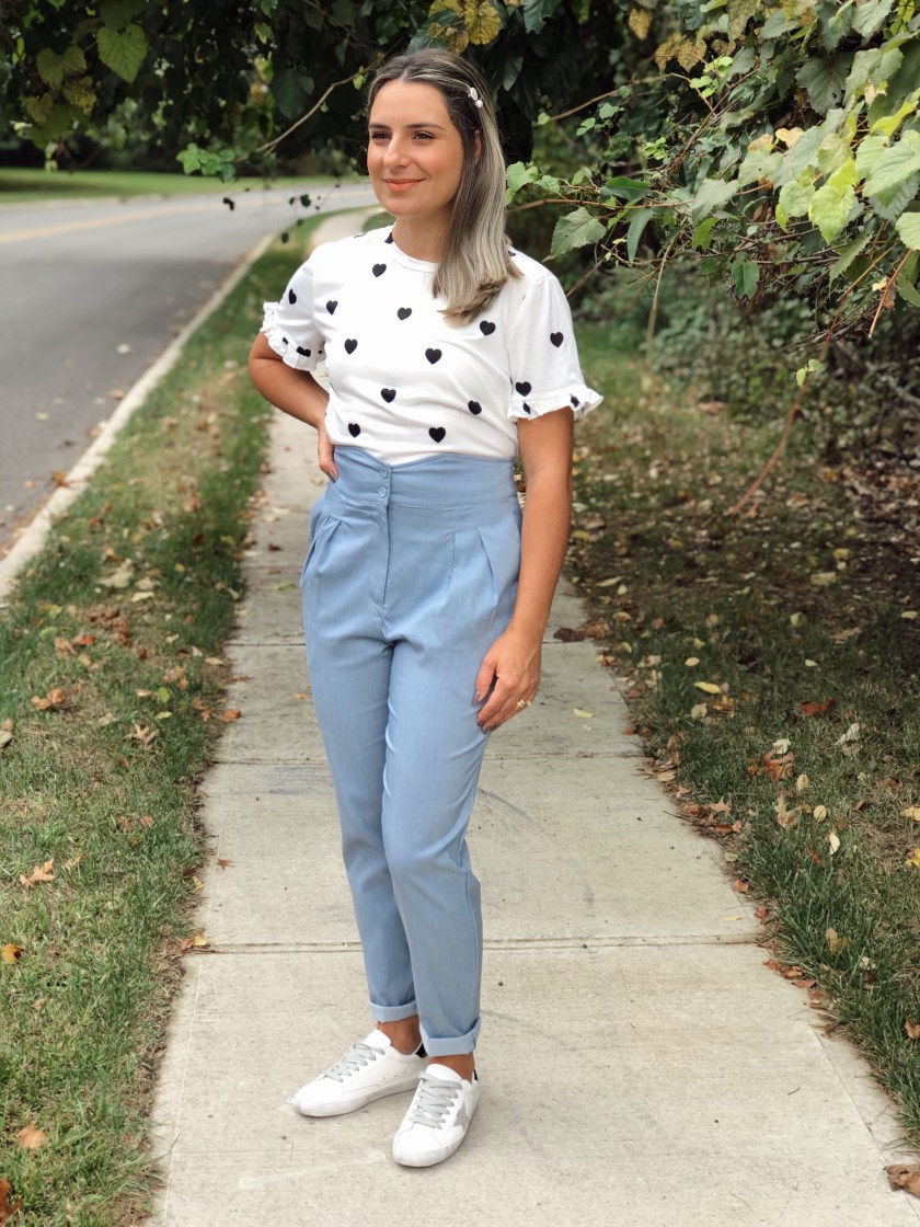 Hey guys! Happy monday! I had a busy day running errands and nothing better that an outfit that can be versatile. I am loving this tailored pants. The material is super soft and the blue looks like denim. What I really like is that you can wear it with sneakers, flats or heels and it looks beautiful. Since I had lots to do, I chose white sneakers thats comfy to walk around and paired it with a cute heart print tee shirt. I love how it turned out. Shein always has great deals and you can use code D2padoni to get an extra 15% off any purchase. Pants: http://shein.top/znn3776 Search ID 1068061 Tee Shirt: http://shein.top/hpip0iq Search ID 1098712 Oiiii, Como foi a segunda feira de vocês! Por aqui um dia bem agitado e nada melhor que uma roupa confortável para passar o dia. Como vocês sabem eu amo uma calça diferente e essa de cintura bem alta e cor estilo jeans fica linda para varias ocasiões. Eu optei por usar um tênis branco e ficou …