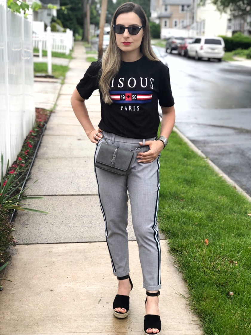 Hey guys! How are you surviving the heat wave? This weekend was super hot here in New Jersey. On saturday we spent the day by the river with the kids and today we stay in with the air condicionar blasting hehe. I did go out to run a few errands and picked a basic outfit: black pants and tee shirt. I love this “mama needs a nap” tee from Shein. It looks super cute with jeans, shorts, leggings. I like to tie a knot in the front to make it more stylish. Its now on sale for $8 and there are tons of colors available. I paired with black high waist pants. These are so nice and dress very well. Its a little bit thick and perfect for dressing up or casually. Its only $12 also on Shein site and you can get 15% off with code 4padoni20 on any purchase. Since my outfit was very simple I played with some fun acessories such as this rattan round bag and my velvet pearl headband that …