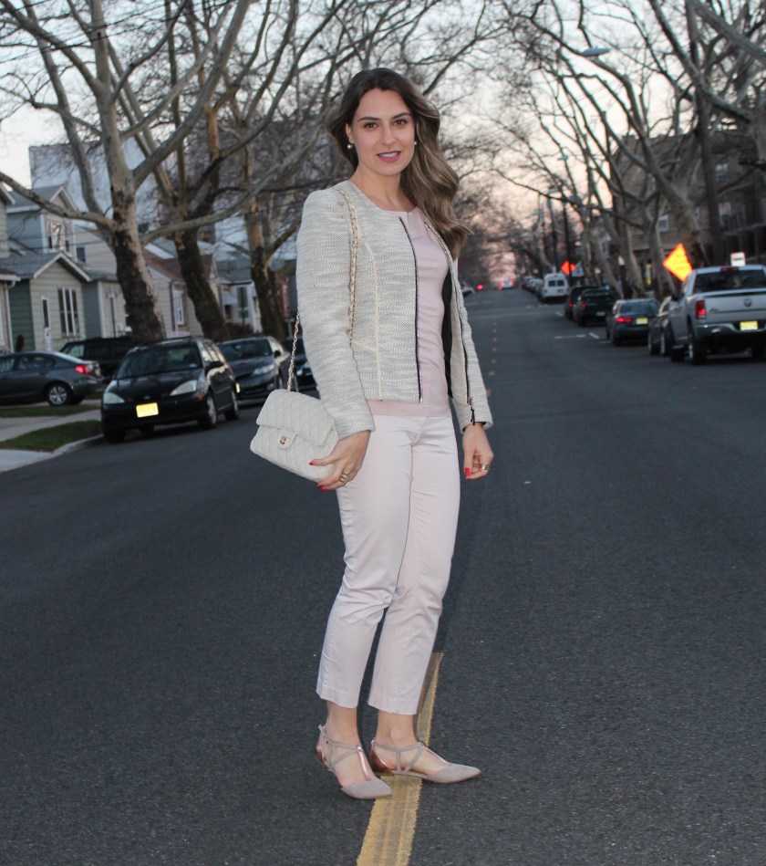 Bom dia flores! Como foi o final de semana de vocês? Espero que tenham aproveitado bastante! O look de hoje usei no sábado para ir a uma festinha surpresa para minha cunhada que esta gravida. Foi um chá da tarde, então escolhi um look mais casual e confortável mas com uma pegada bem romântica e feminina usando tons mais claros na cor “blush”, um rosinha pastel que esta super em alta nessa temporada. Adoro produções em tons mais claros para a primavera, mas venho acompanhando que essa tendência esta pegando ate para o inverno! Para meu look escolhi uma calça um pouco mais curta, estilo chino, uma blusinha de algodão em manga 3/4 e joguei um casaquinho de tweed por cima. Finalizei com bolsa e sapatilha em tons neutros. Vejam como ficou: Espero que tenham gostado do look e que sirva de inspiração! Tenham uma semana linda e cheia de coisas boas! Calça, camiseta e Casaco: H&M Sapatilha: Mossimo @Target Bolsa: TJMax Relógio: Michael Kors Batom: NYX Matte – Natural