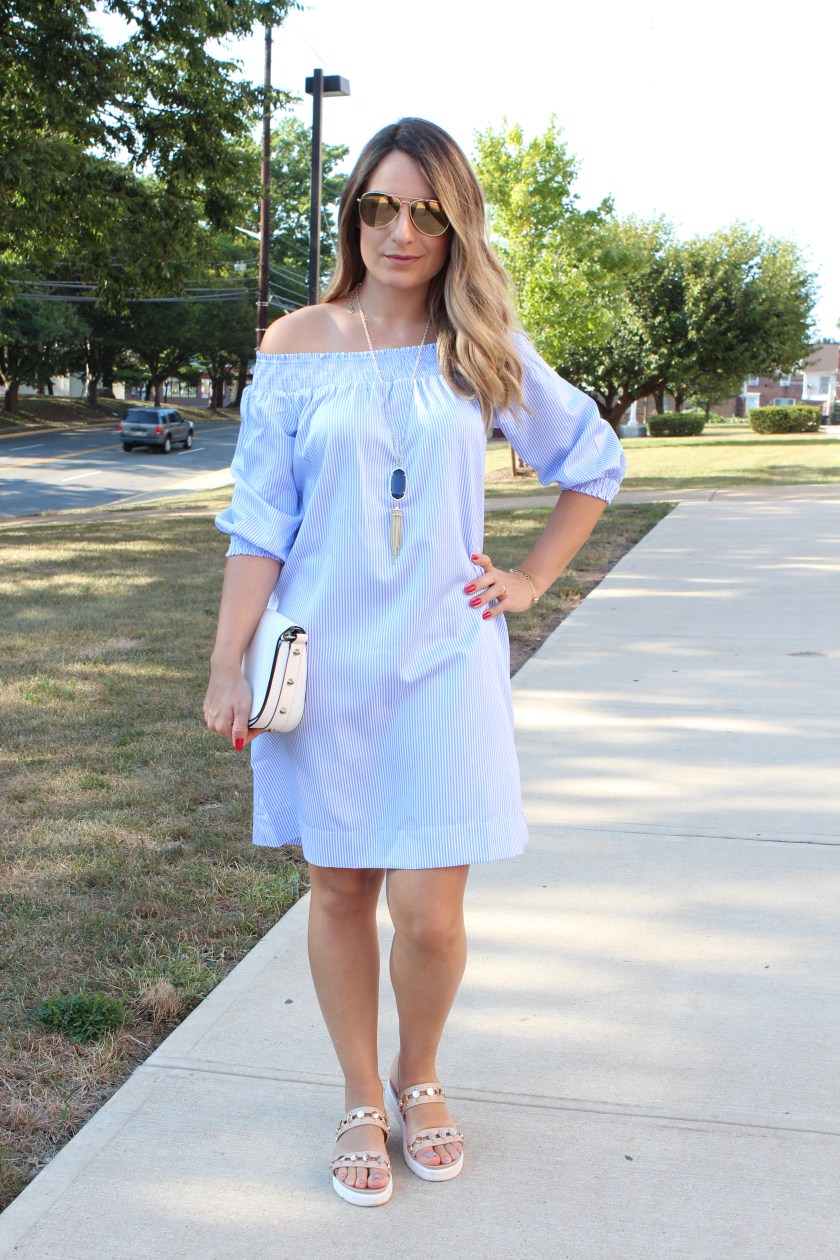 Bom dia girls!!! Como foi o seu final de semana? Por aqui foi bem tranquilo e relax e aproveitei o domingo de sol para usar esse vestidinho lindo que recebi da Make me Chic. Ele é todo listrado de branco e azul no modelinho shift, que fica mais soltinho no corpo e vai até a altura do joelho. Adoro esses vestidos para o dia a dia. A parte de cima é em elástico com o decote ombro a ombro e meia manga. Combinei com uma rasteirinha nude com detalhes em dourado. Vejam como ficou:  Gostaram do look meninas? Vestido: Make me Chic Bolsa: H&M Sandalia: Aldo Colar: Rocksbox Oculos: H&M